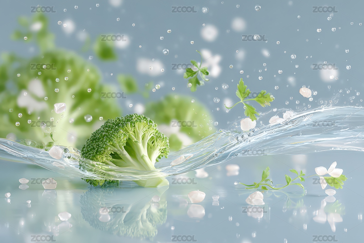 新鲜多汁的番茄和生菜在阳光下被水花溅湿