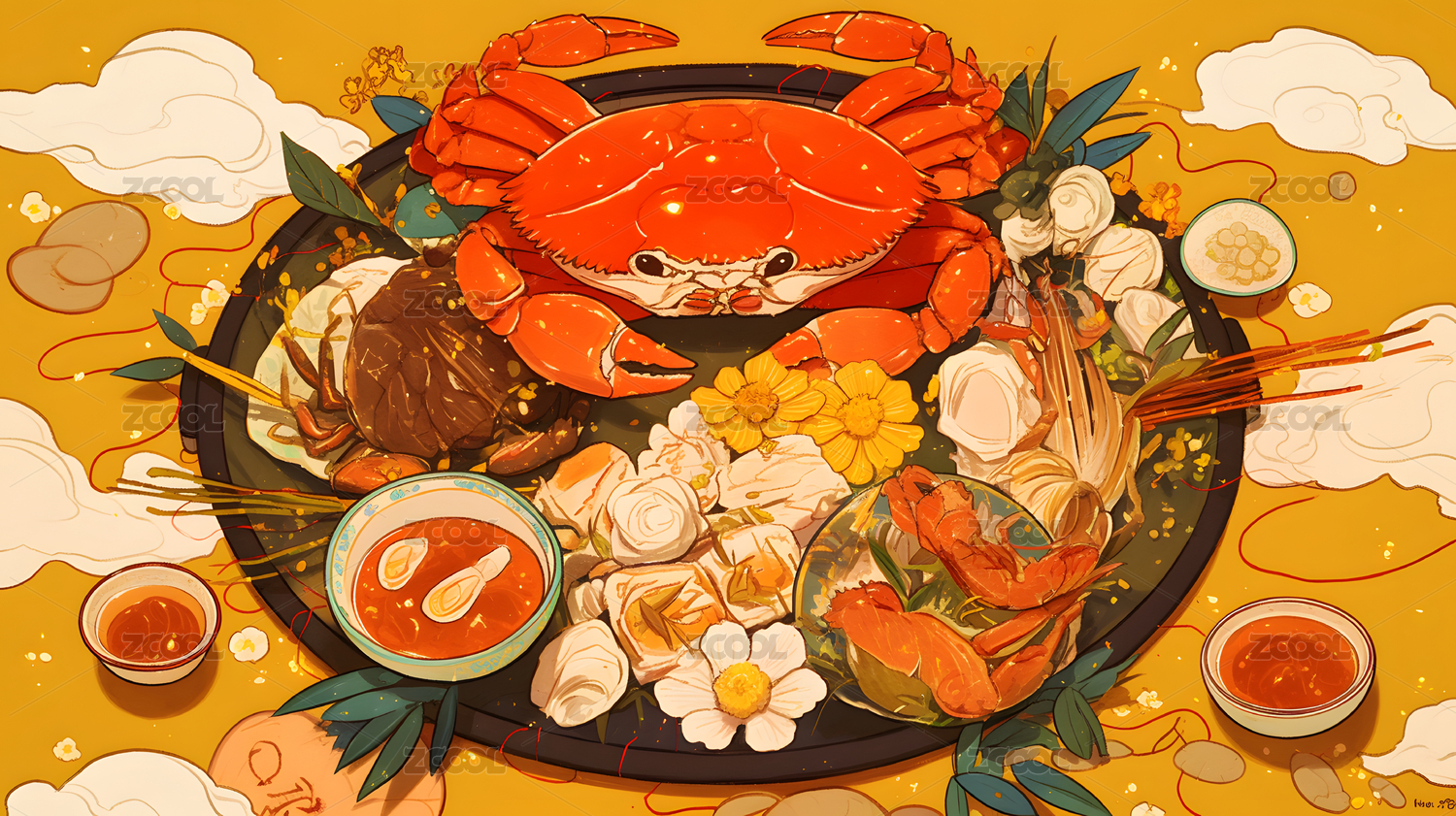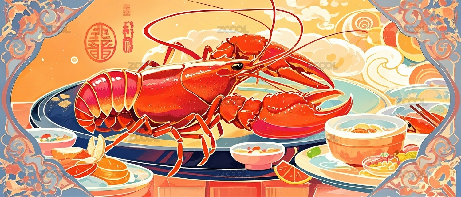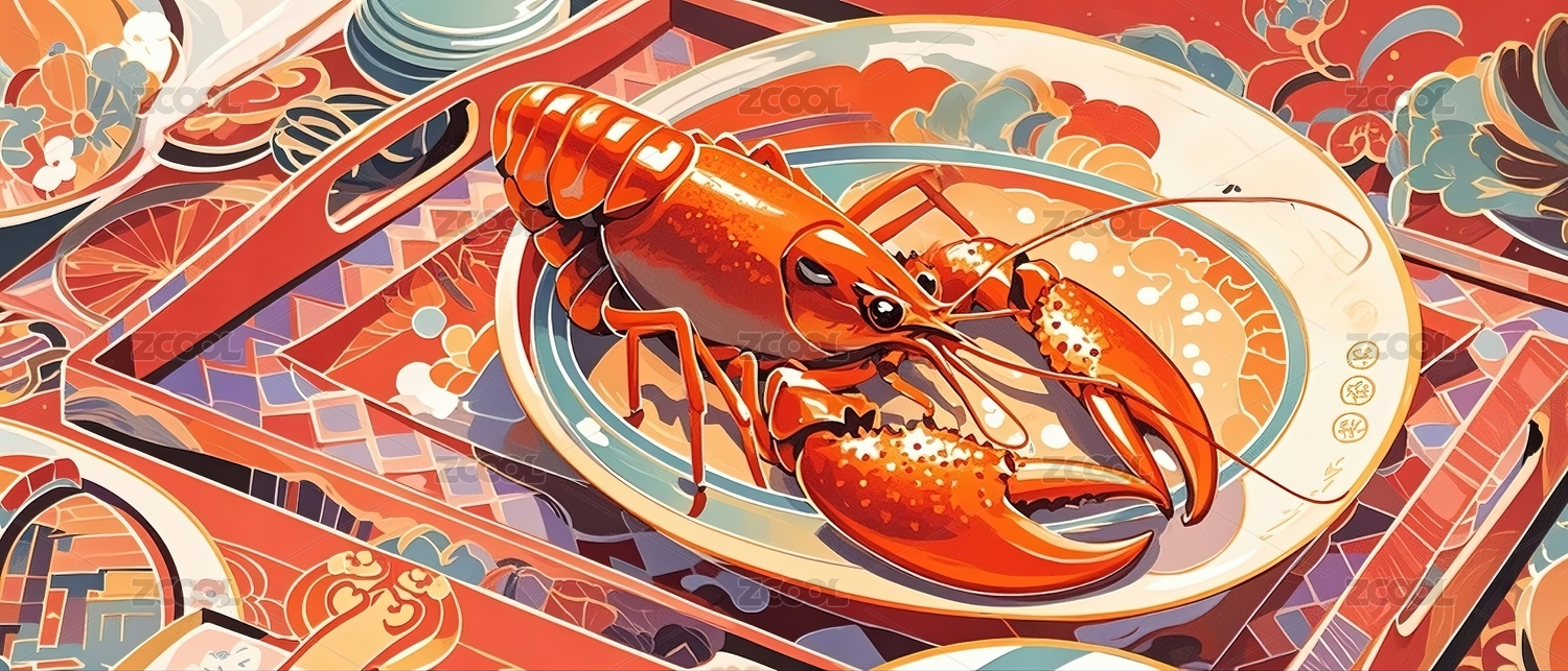 小龙虾,国潮,食物,美食,熟食,盘子,虾,水产,插画,筷子