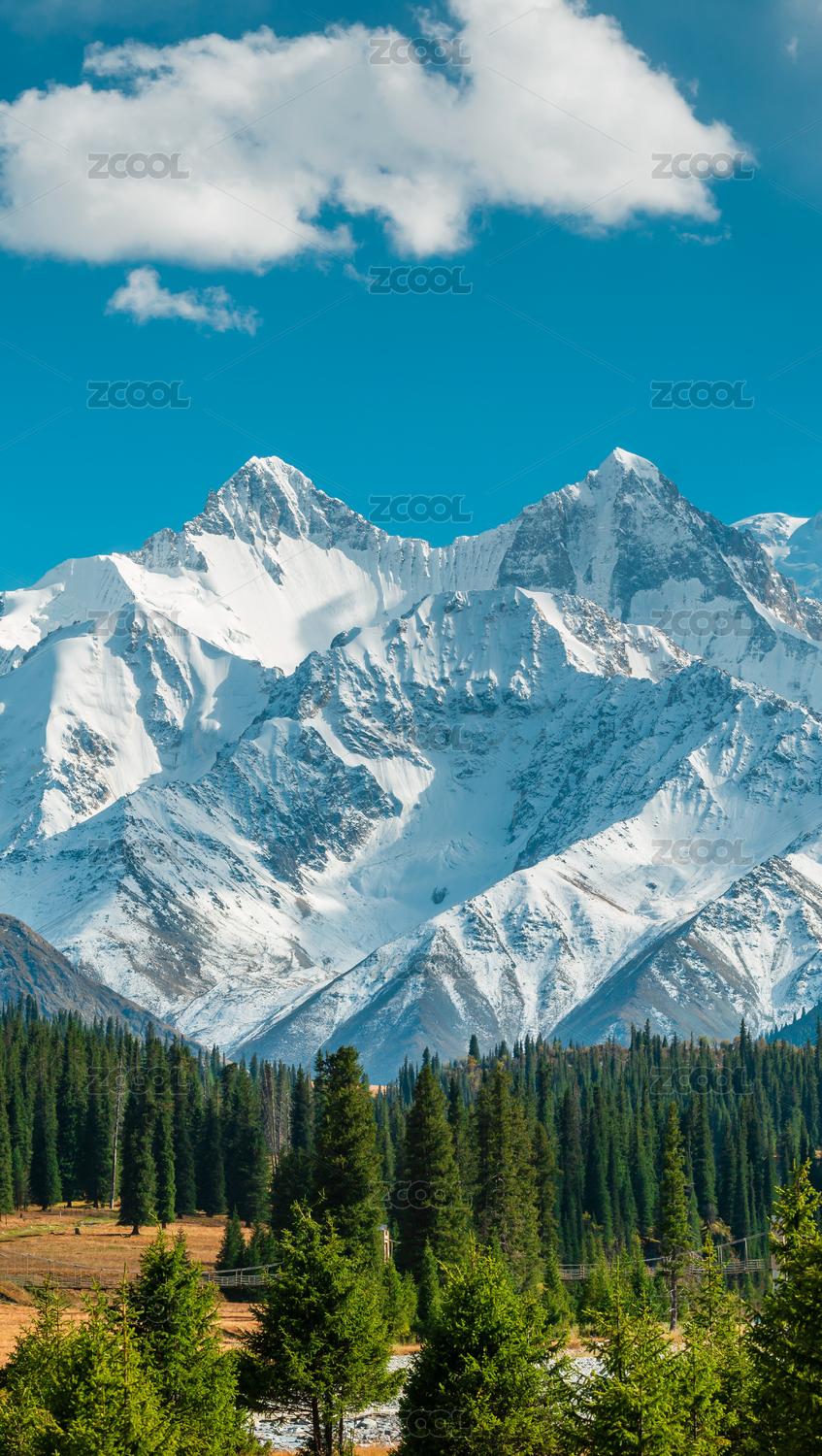 中国新疆伊犁木扎尔特冰川雪山森林自然风光