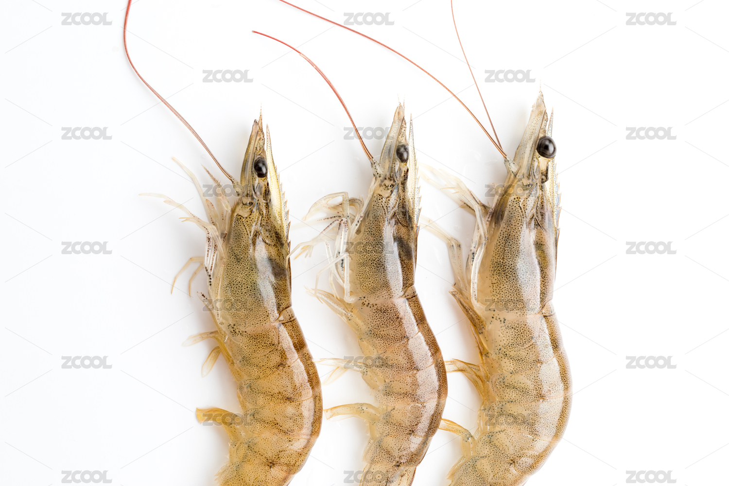 白色背景中三只新鲜的基围虾