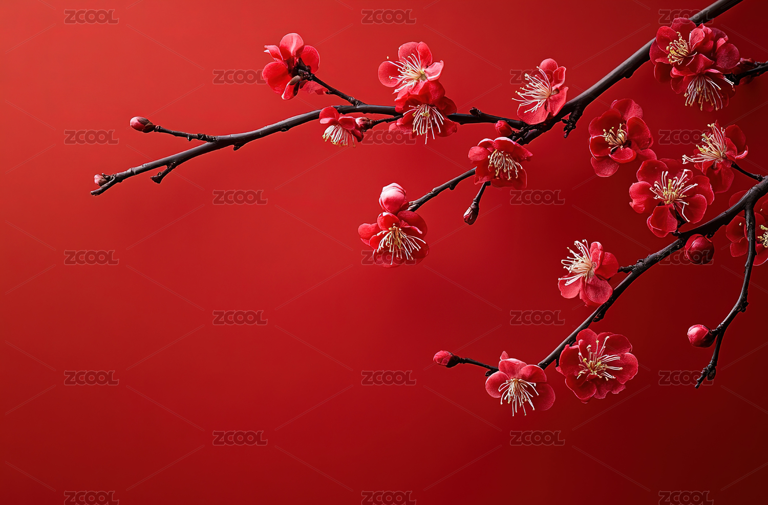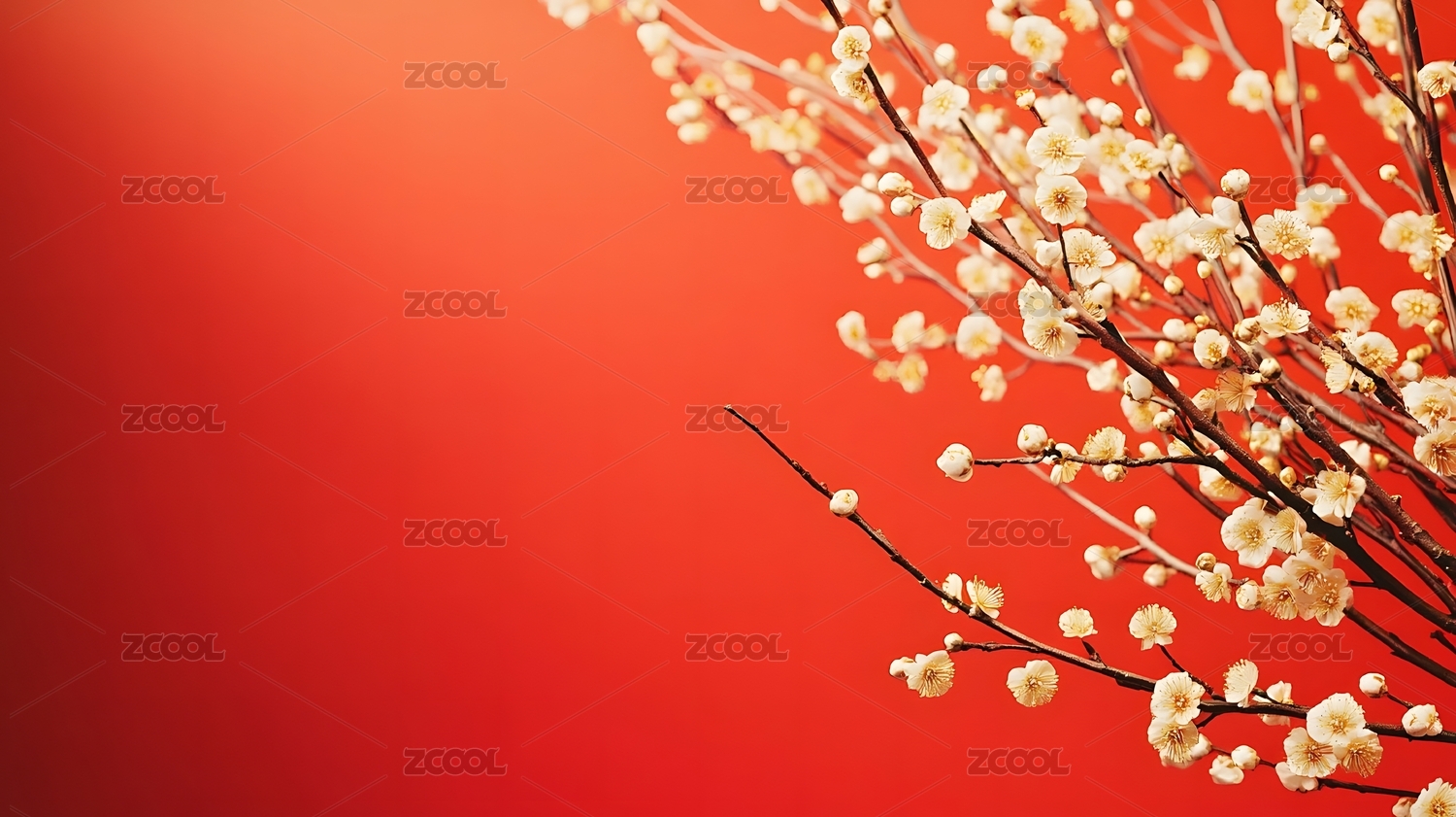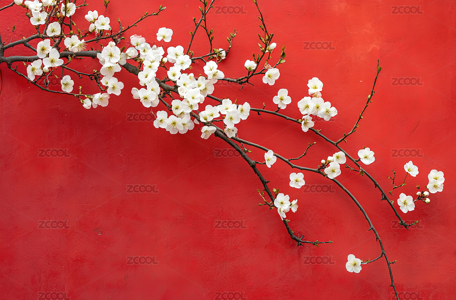 春天,中式建筑红色院墙前映衬着盛开的杏花