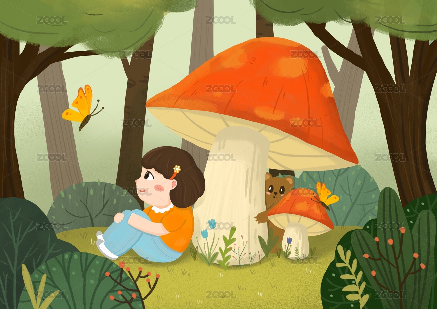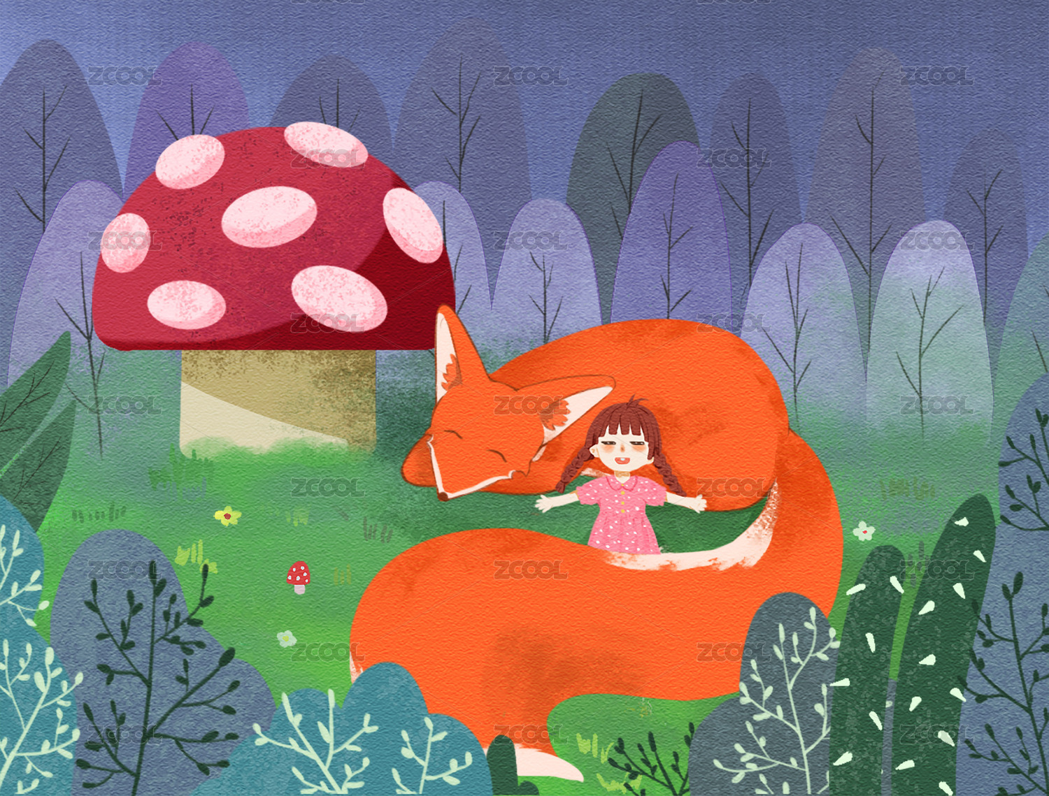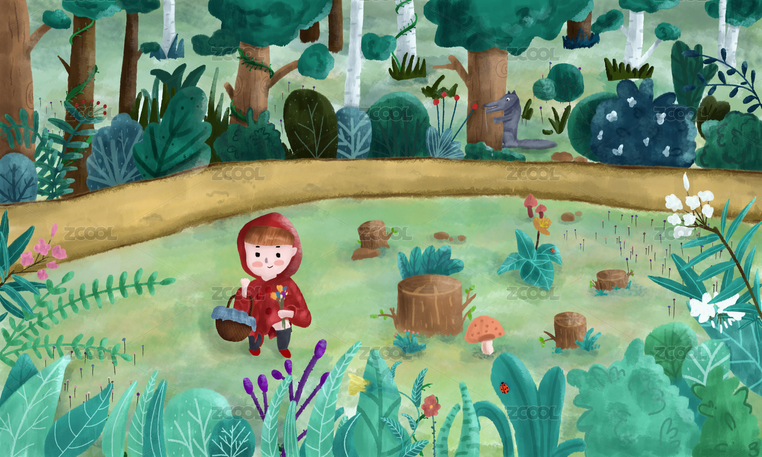 一只大灰狼在跟踪一个戴红色帽子提着篮子在森林里摘野花的小女孩