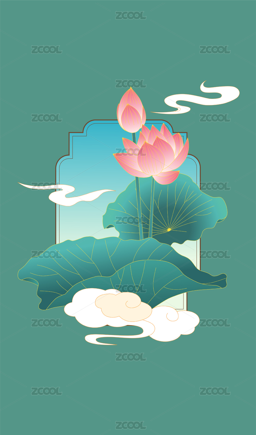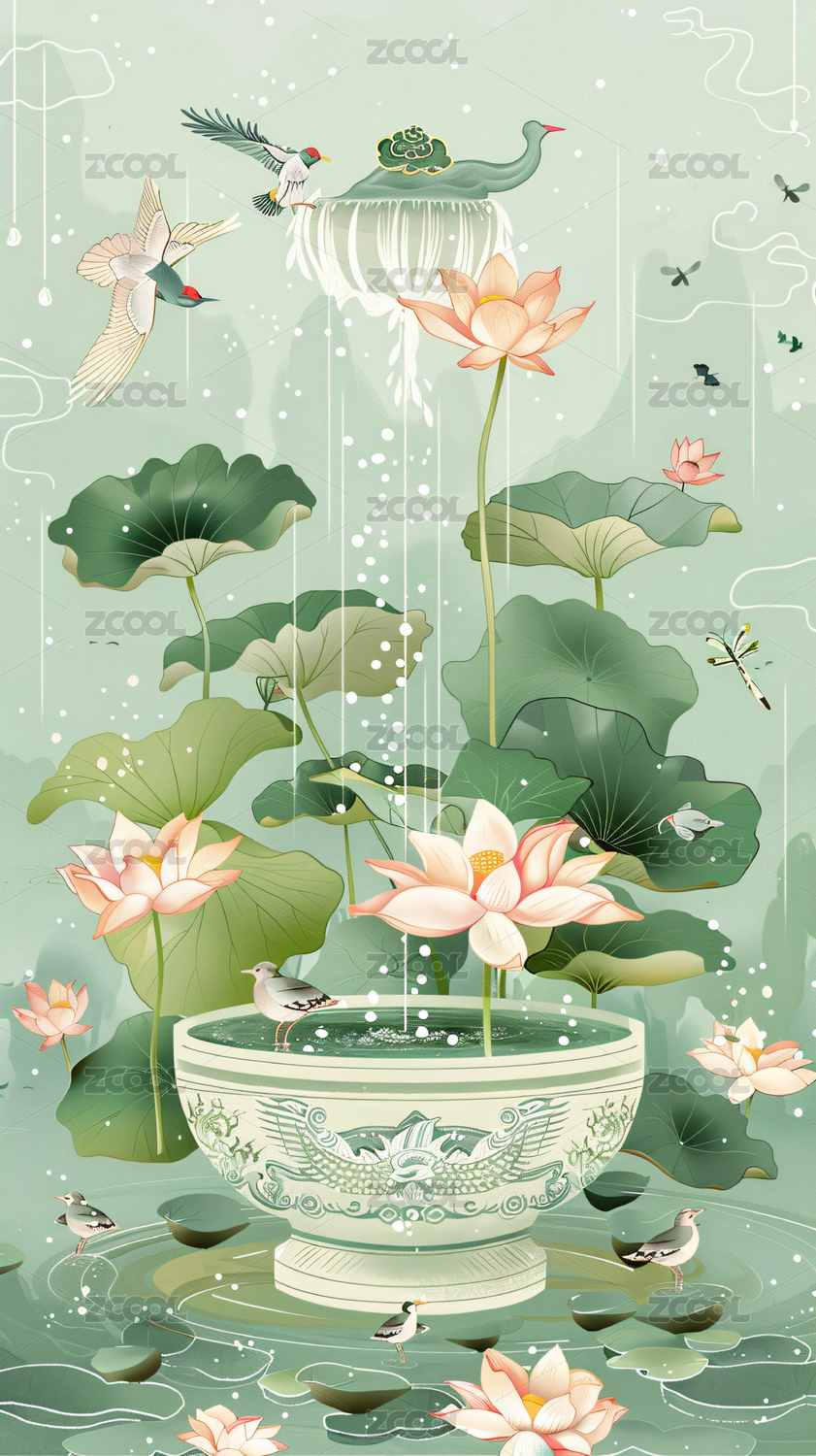 AIGCFG,无人,国风,国潮风,插画,图像,荷花,池塘,葫芦,夏天