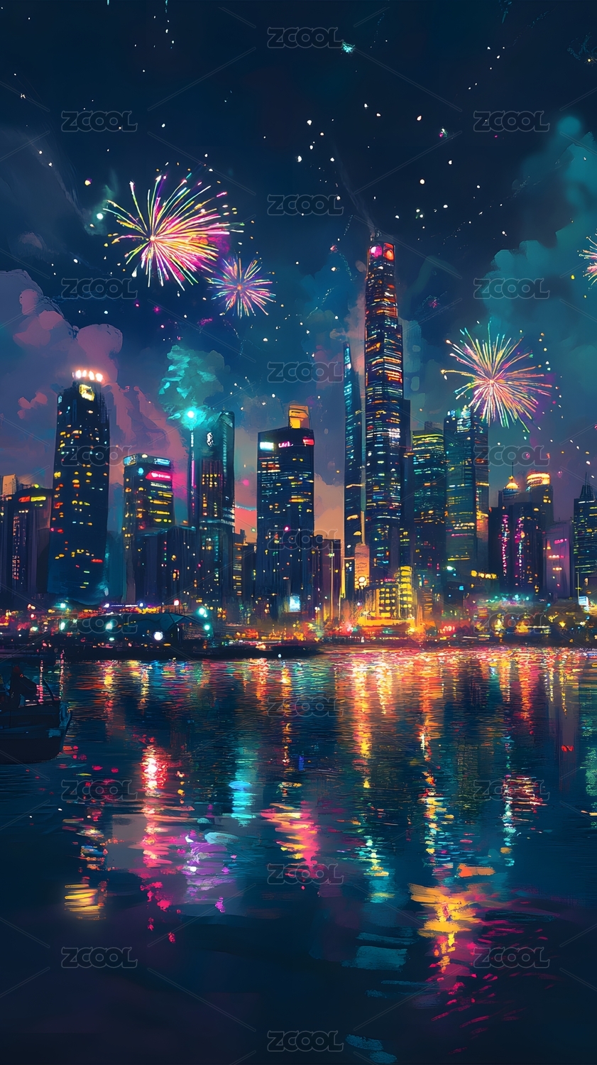 城市风光与烟花