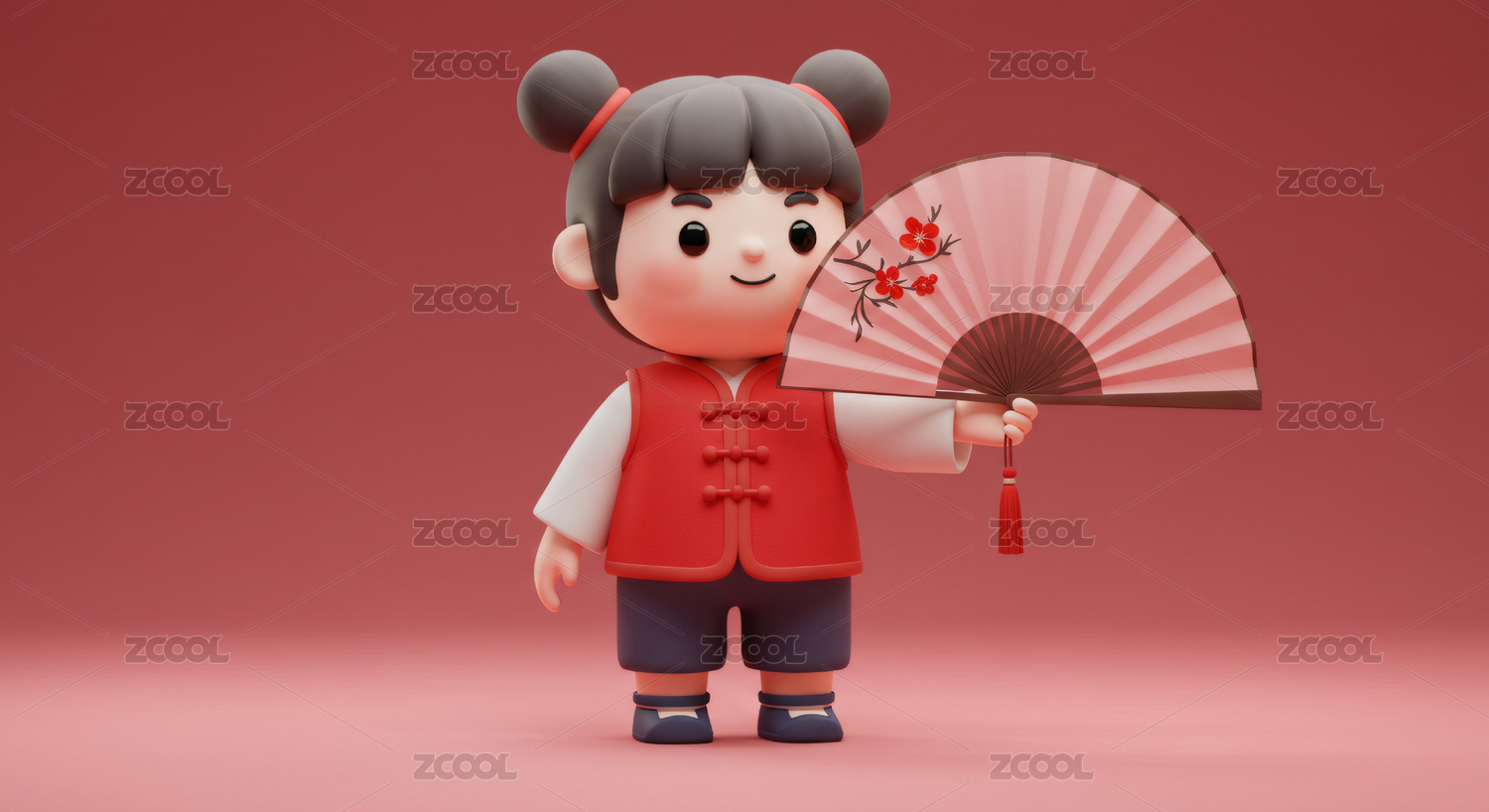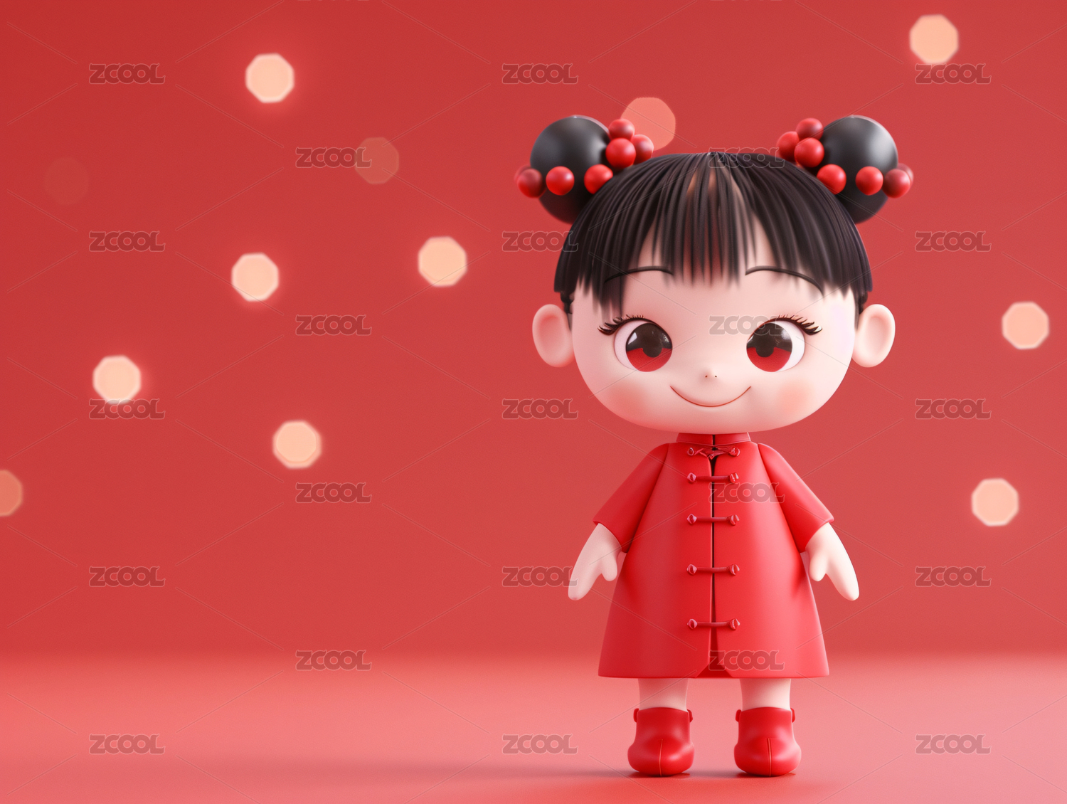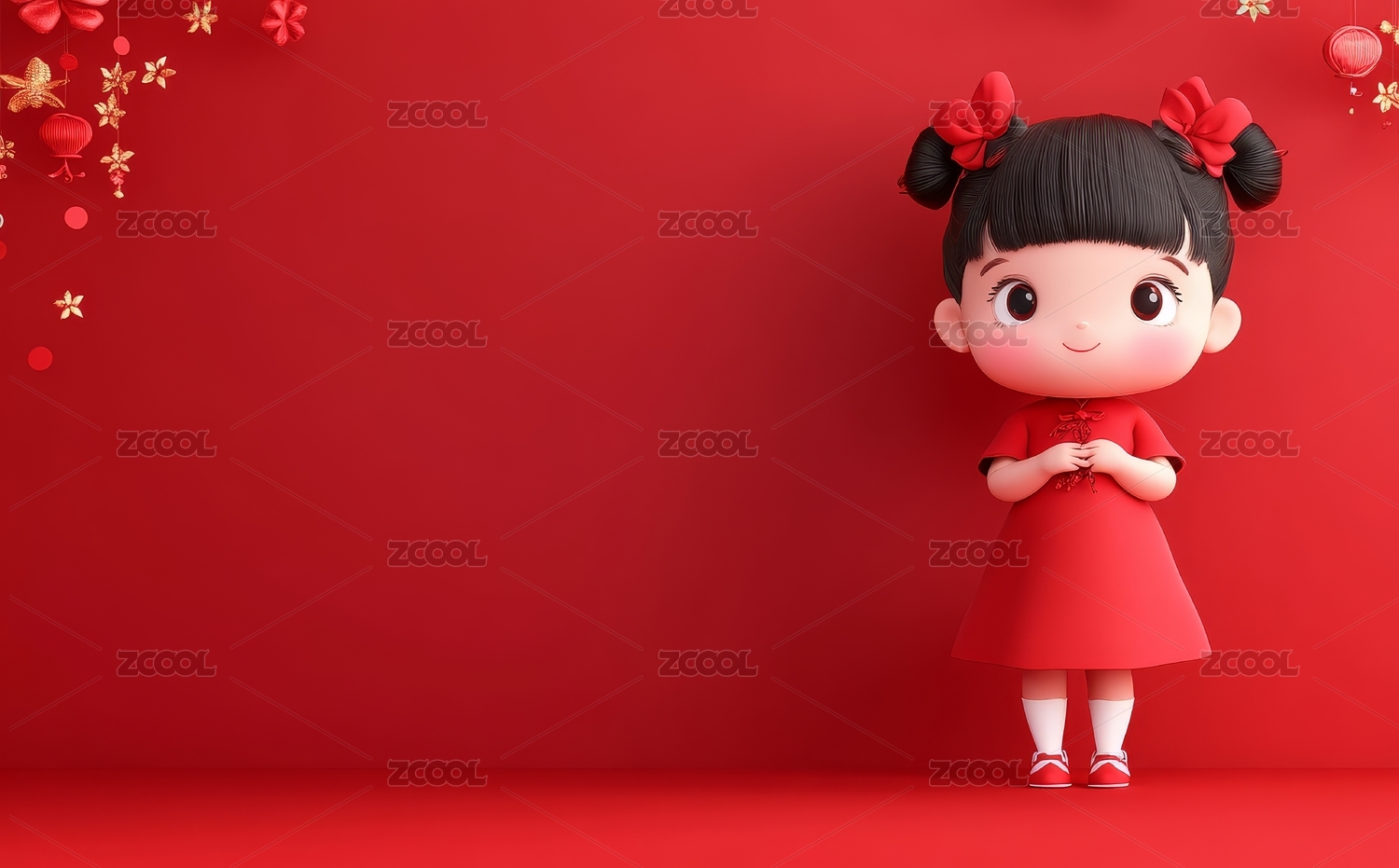 卡通,女孩,中国风,新年,喜庆,红色,可爱,插画,动漫,中国