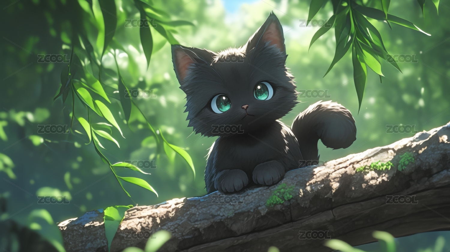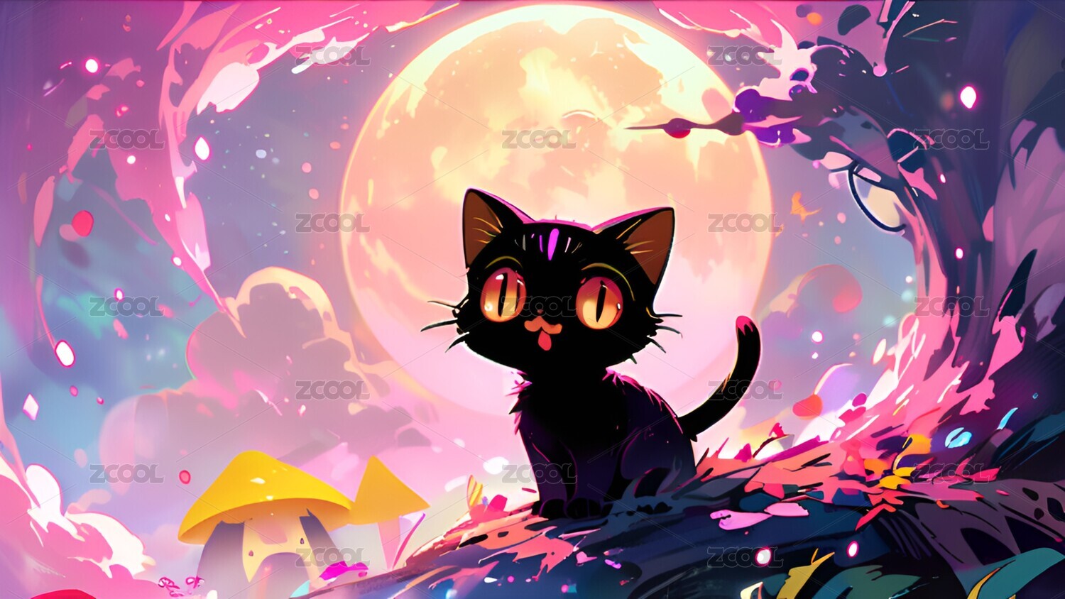 夜空下的小猫,发光的毛被月光照亮,眼中充满了奇迹和好奇心