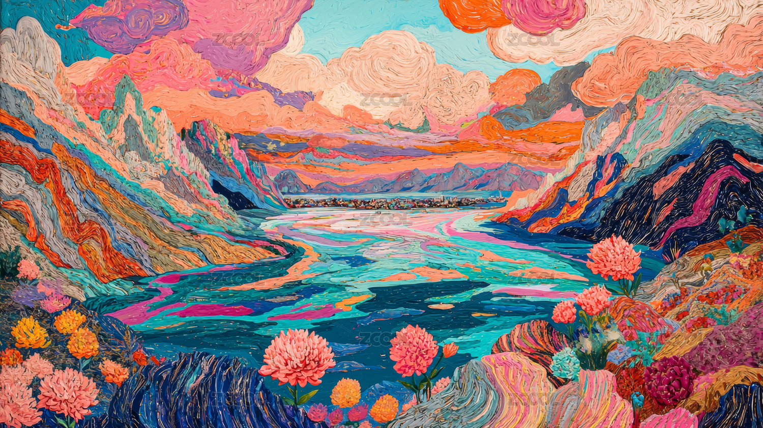 山川湖泊和鲜花多彩抽象艺术油画壁纸