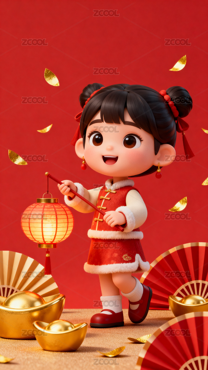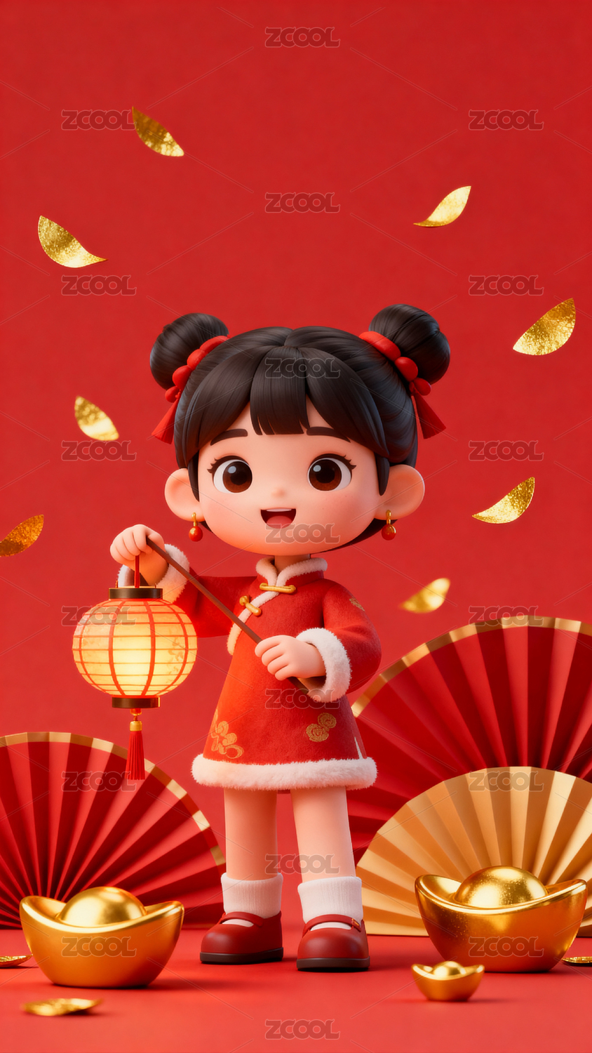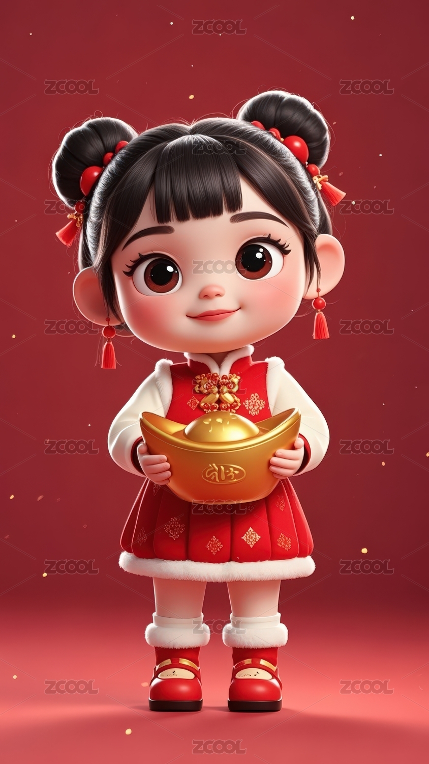 女孩, 可爱, 3D, 新年, 喜庆, 红色, 服装, 中国风, 微笑, 金元宝