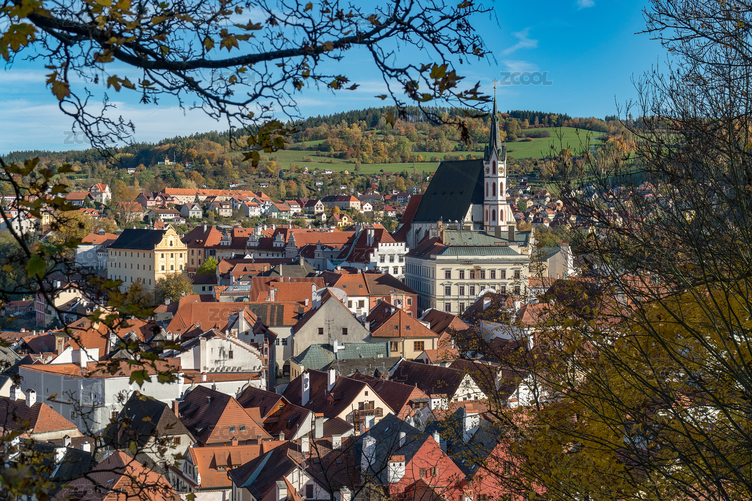 欧洲捷克克鲁姆洛夫小镇近景带树枝画面