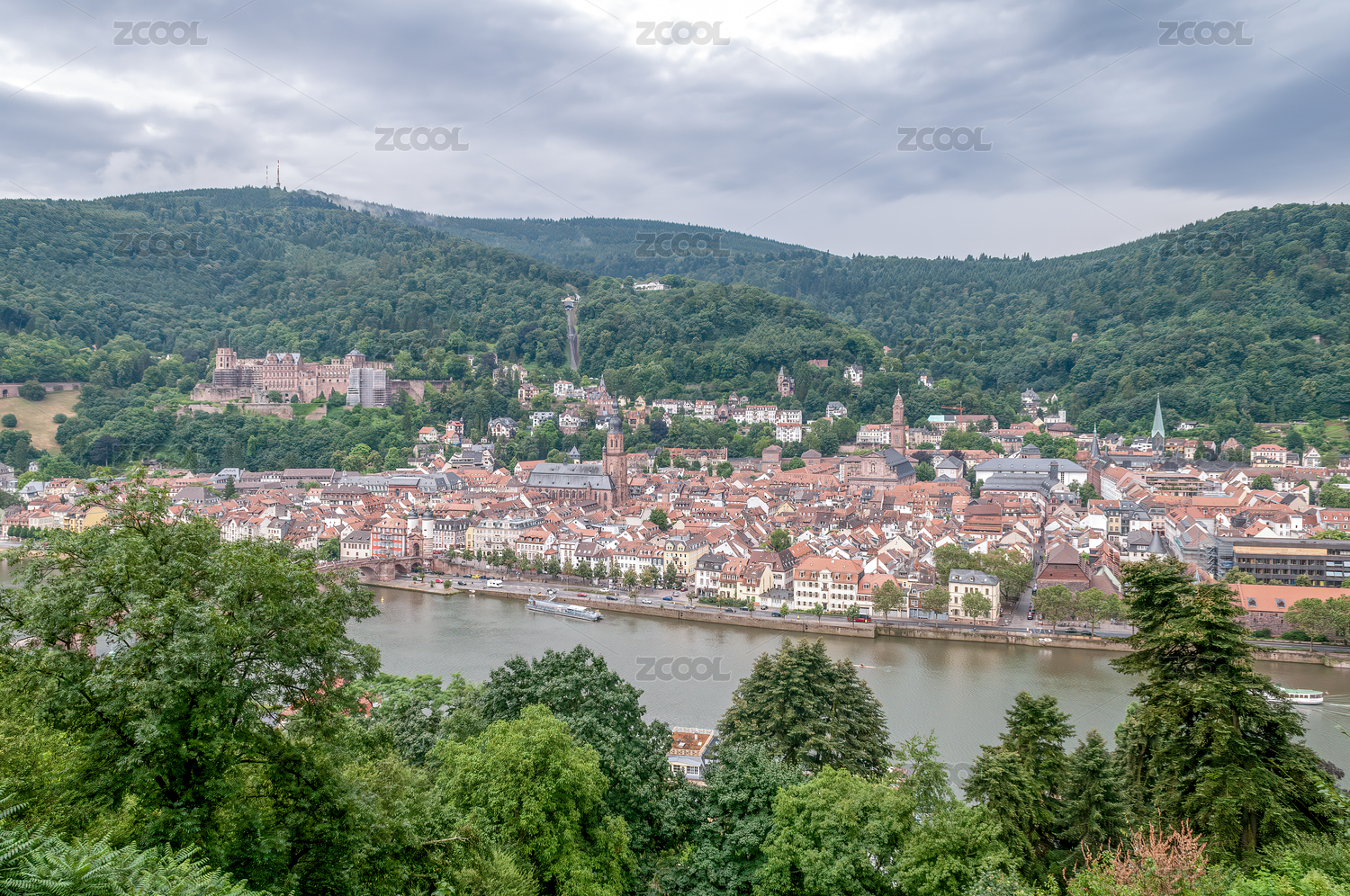 山顶俯瞰德国海德堡老桥、老城区、城堡建筑