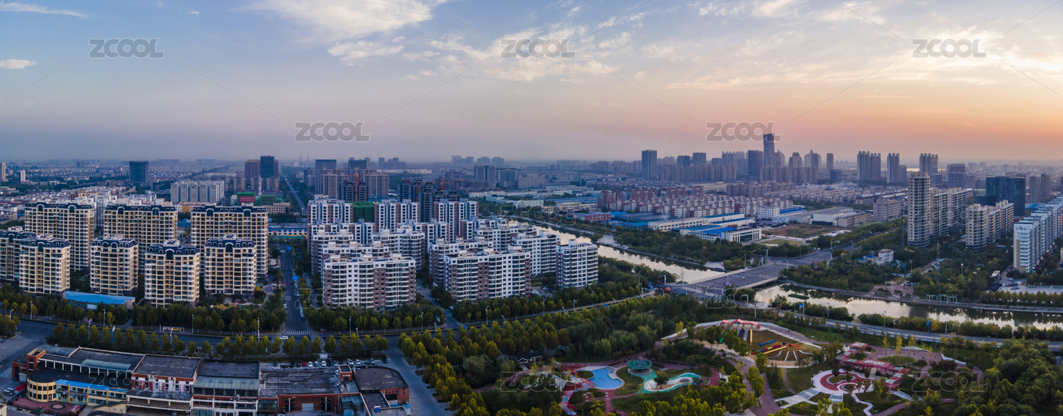 朝霞下的山东东营城市建筑群航拍图