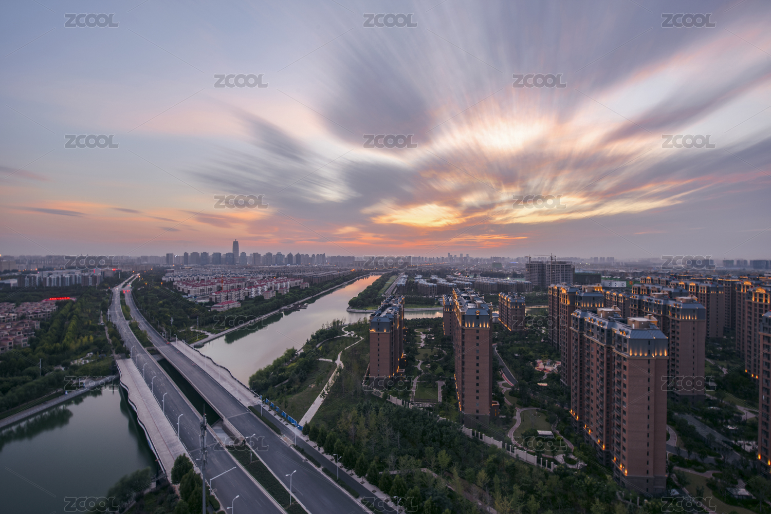 朝霞,山东,东营,城市,日出,朝阳,建筑群,河流,航拍,俯视图
