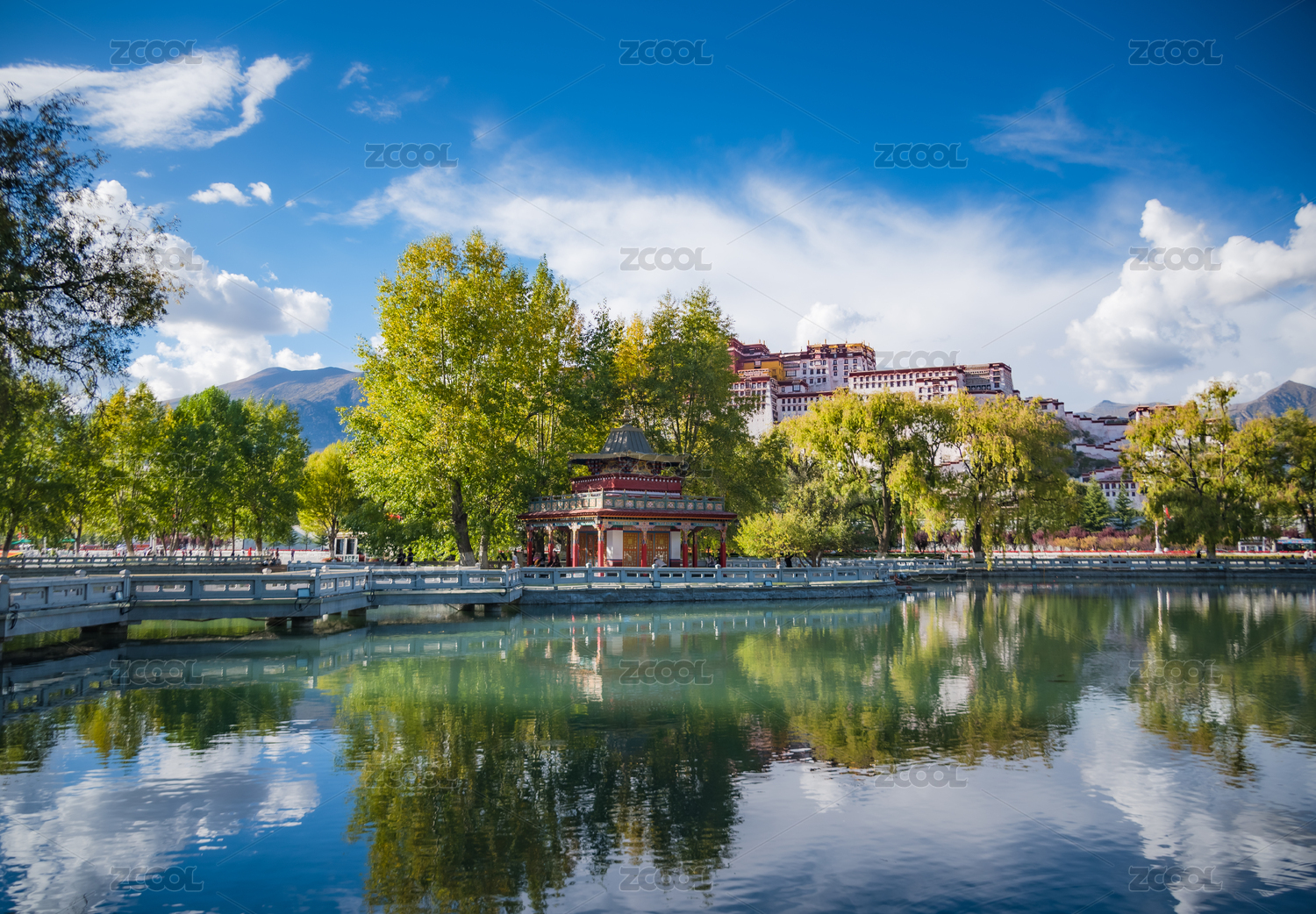 西藏拉萨布达拉宫古建筑与城市公园湖泊