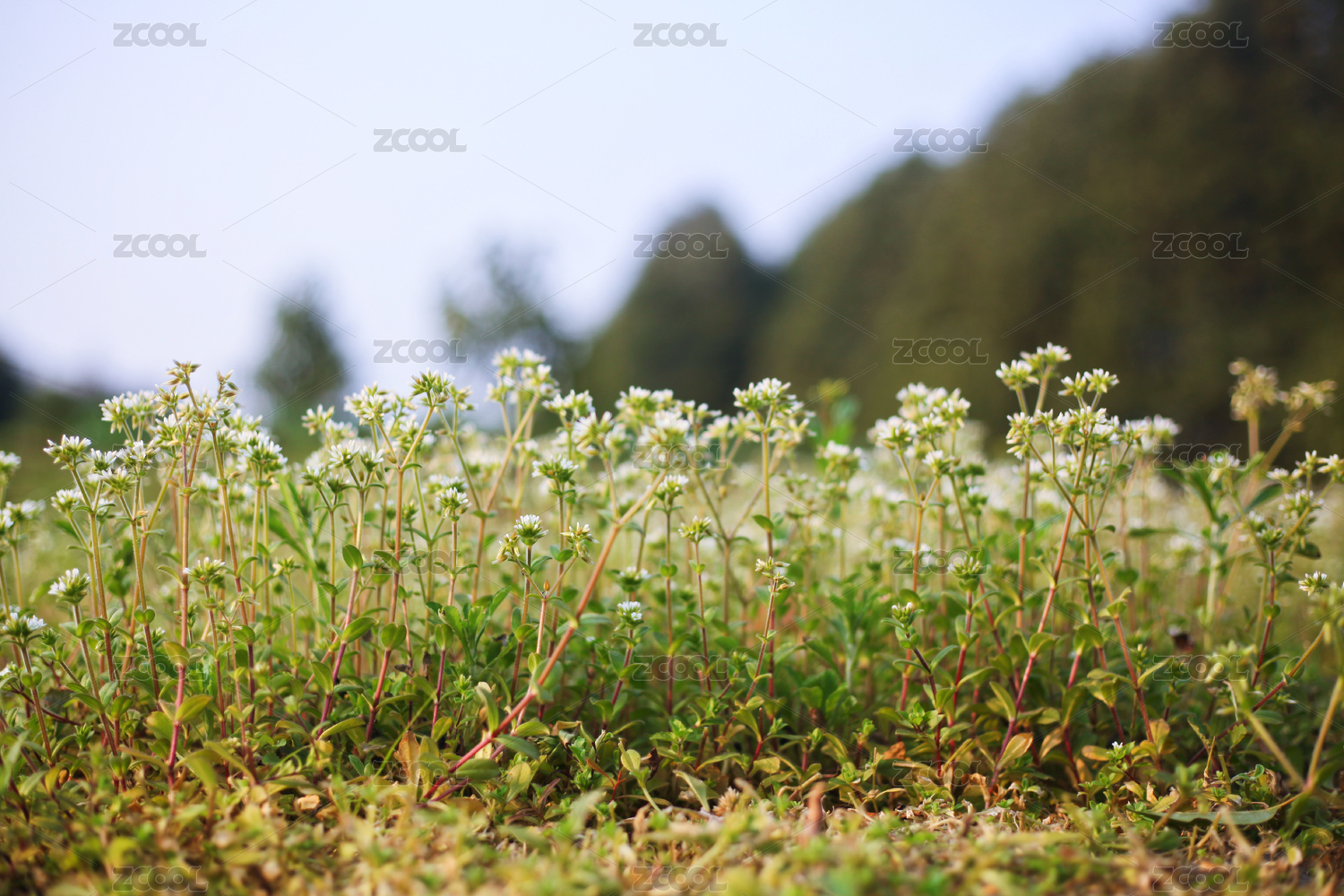 春天大自然中的绿色叶子白色鲜花的自然风景