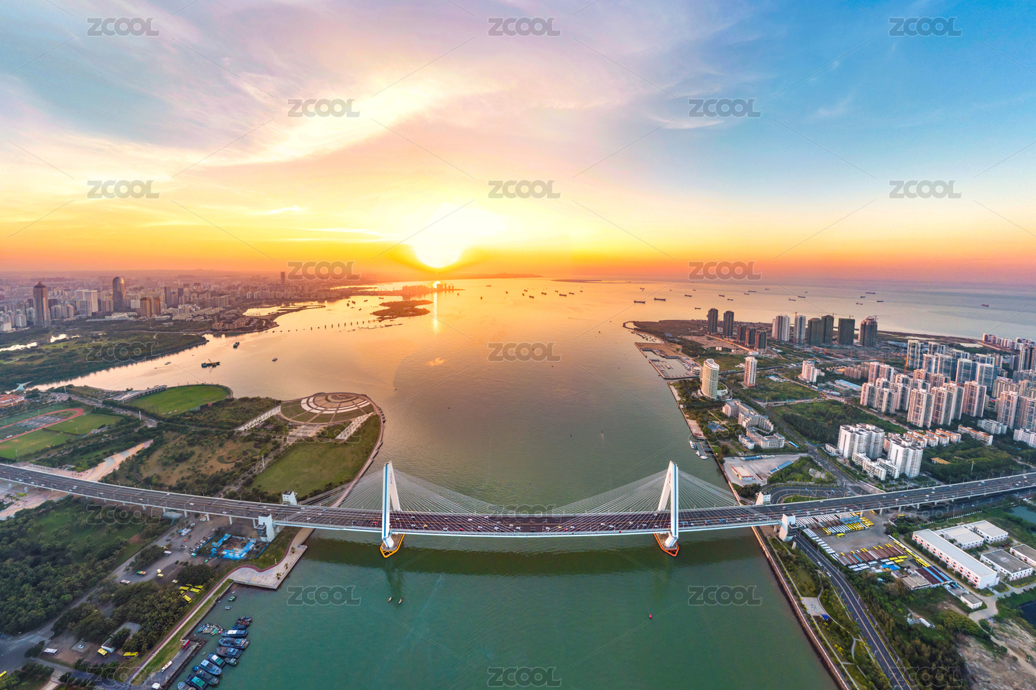 广东省湛江海湾大桥黄昏航拍全景
