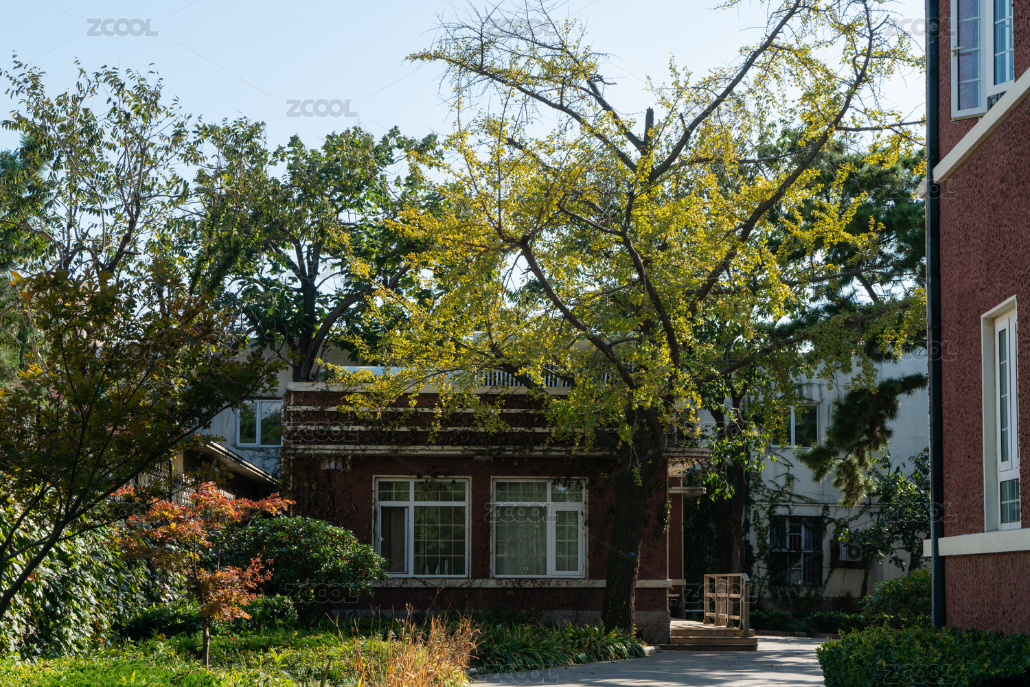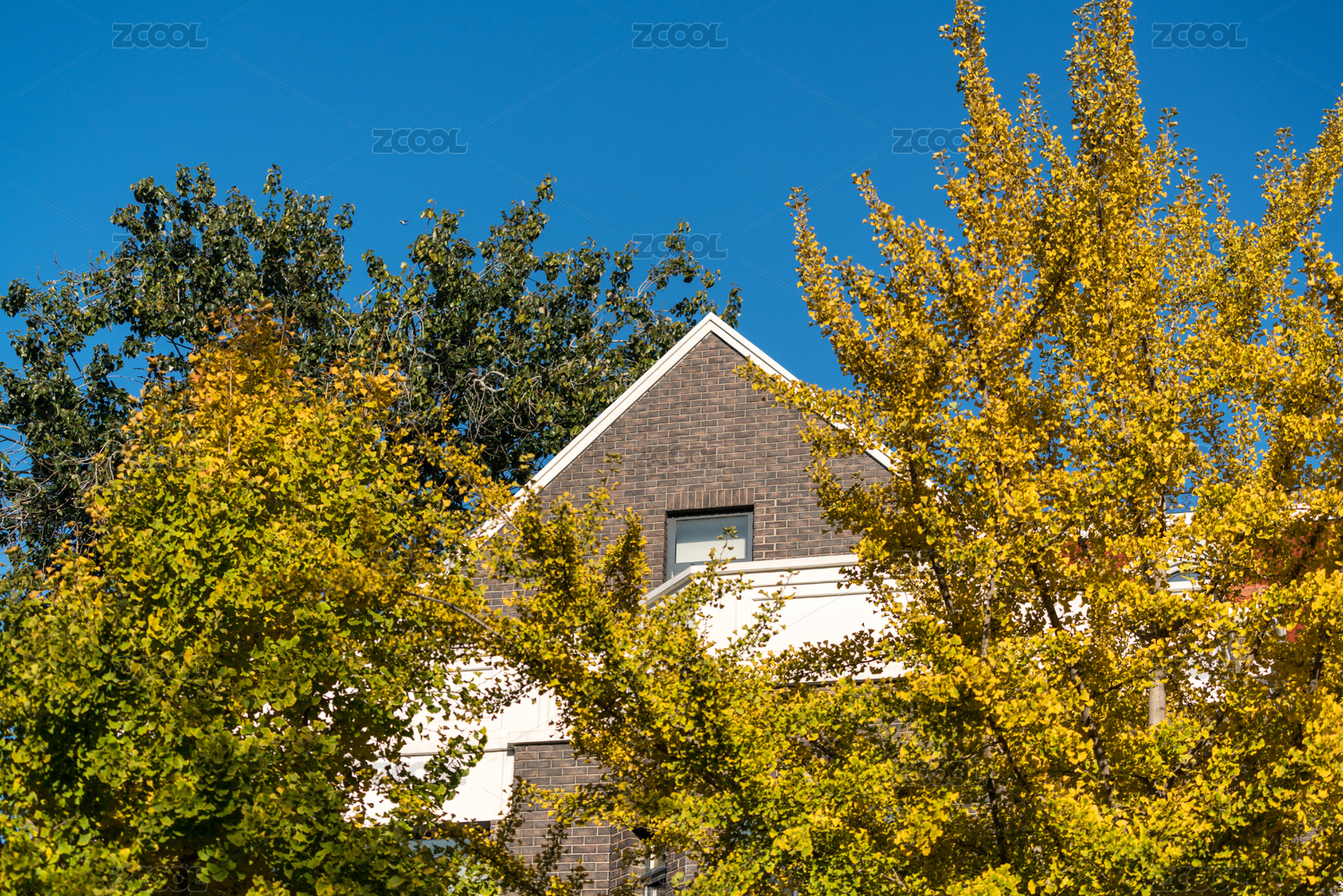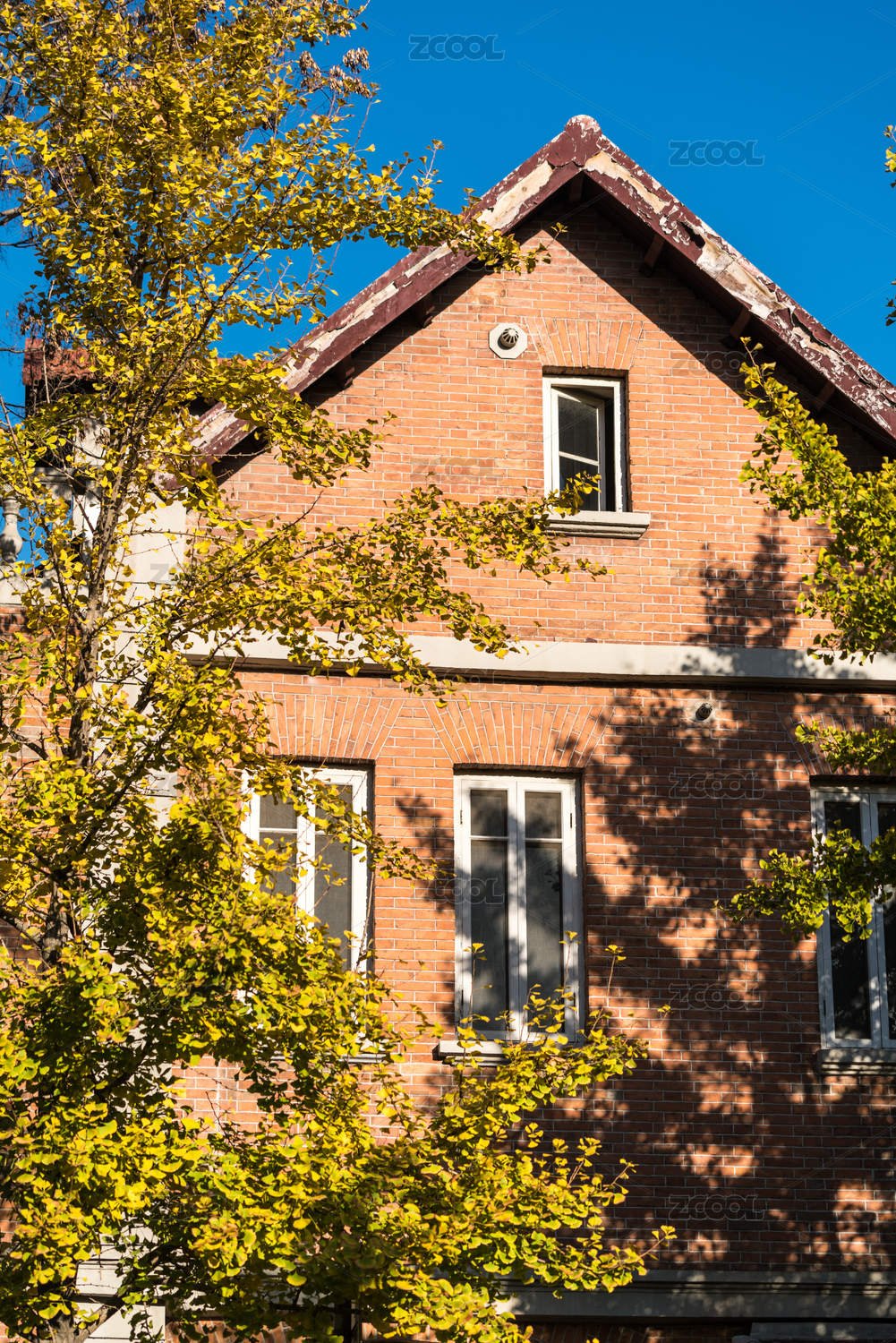 晴空秋叶下的红砖家园