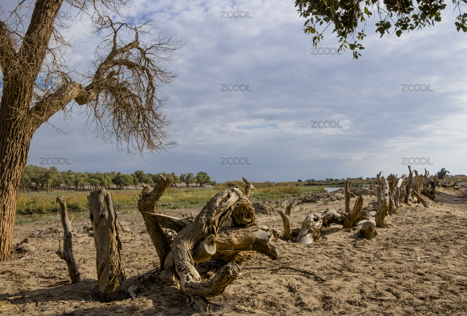 中国新疆布尔津县五彩滩上茯倒的胡杨树