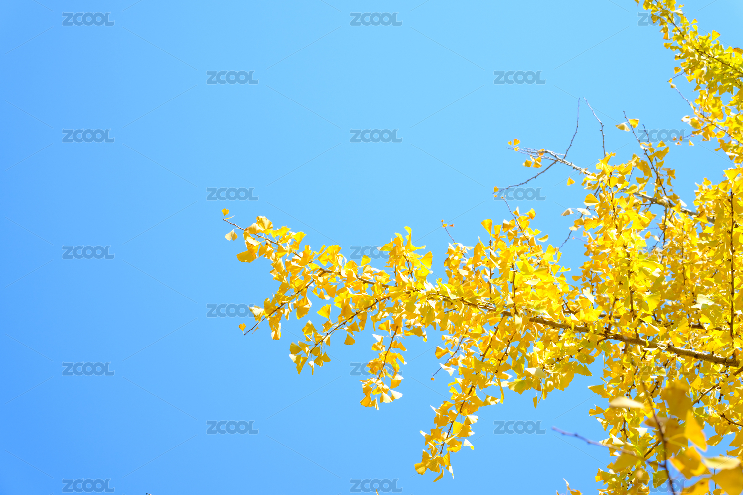 秋天里背景是蓝天的黄澄澄的银杏叶特写