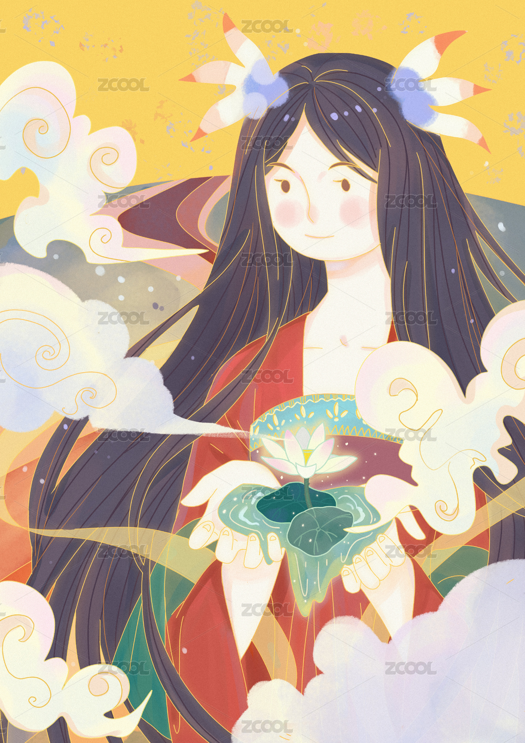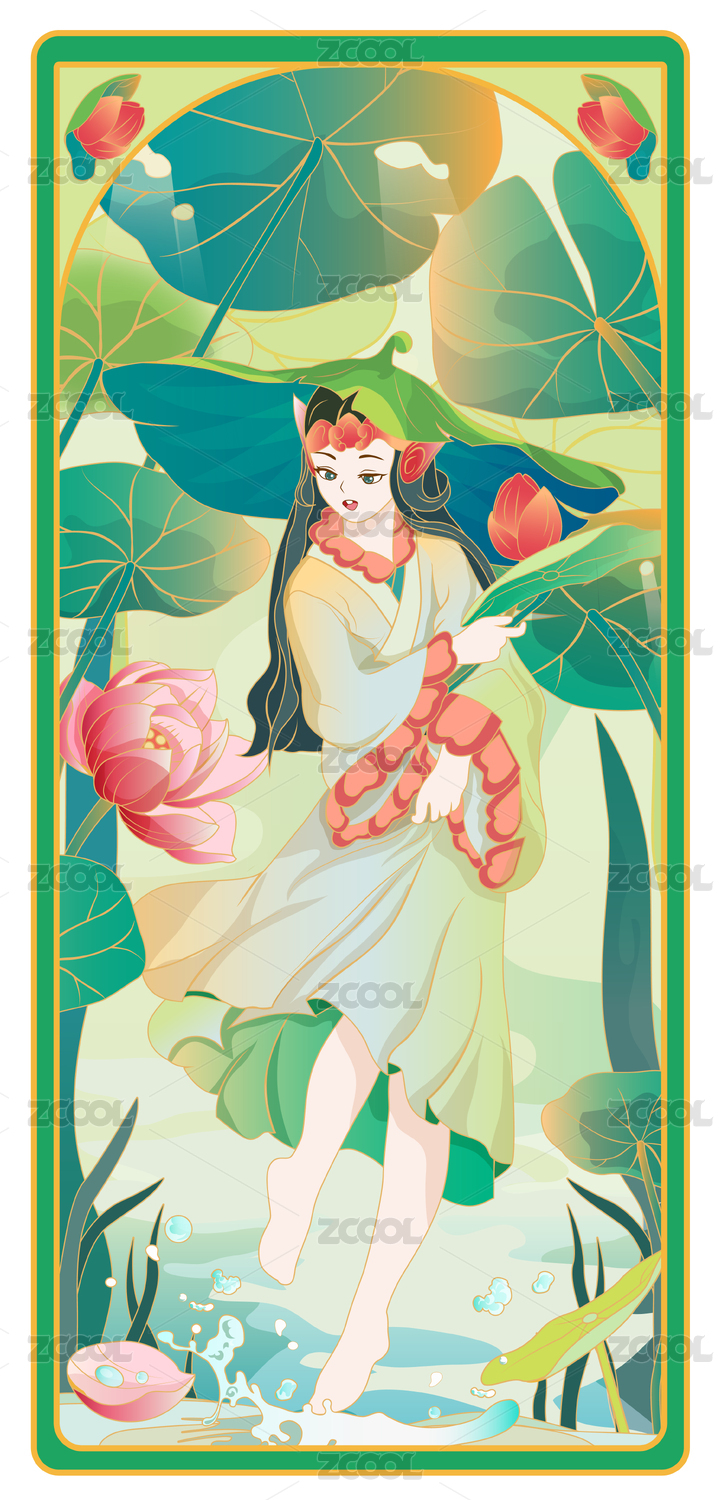 夏日荷塘采莲的古装少女 夏季拟人插画