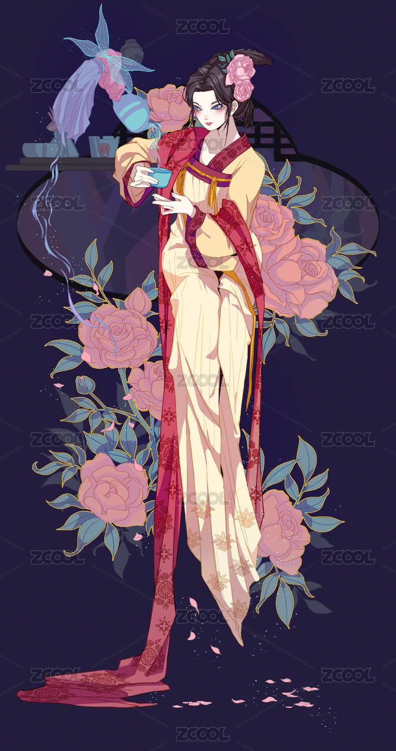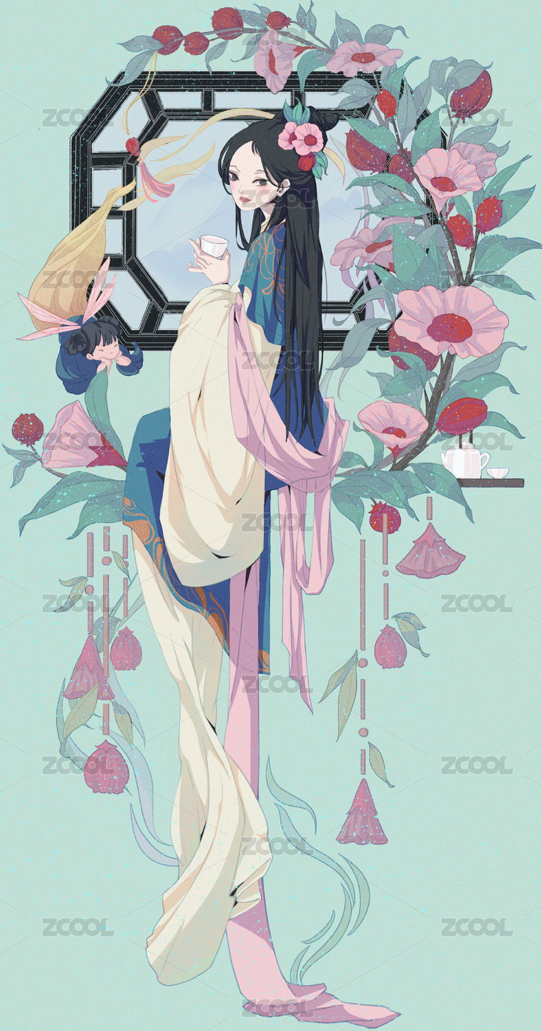 中国风古风汉服细线人物花卉插画-洛神喝茶