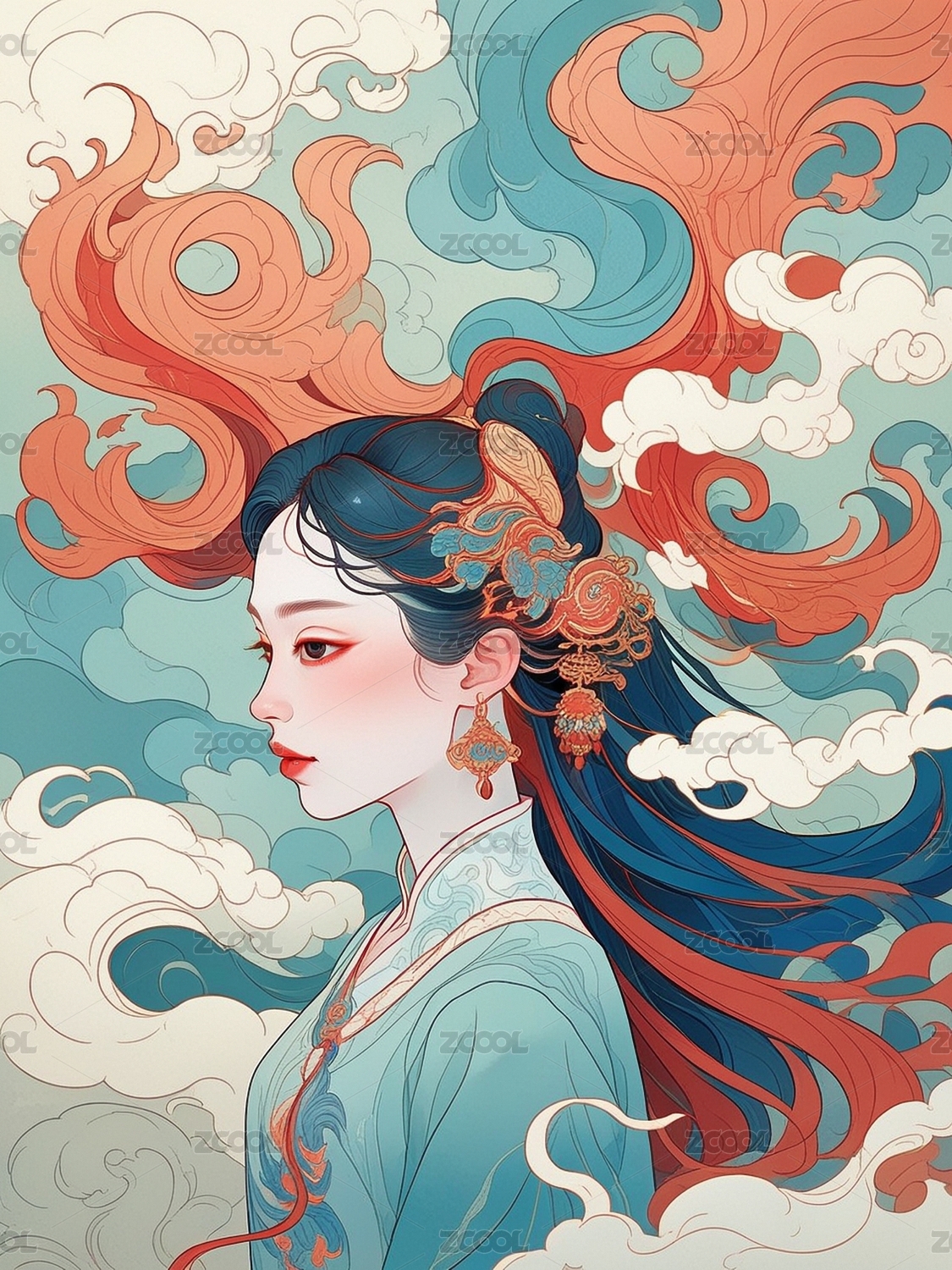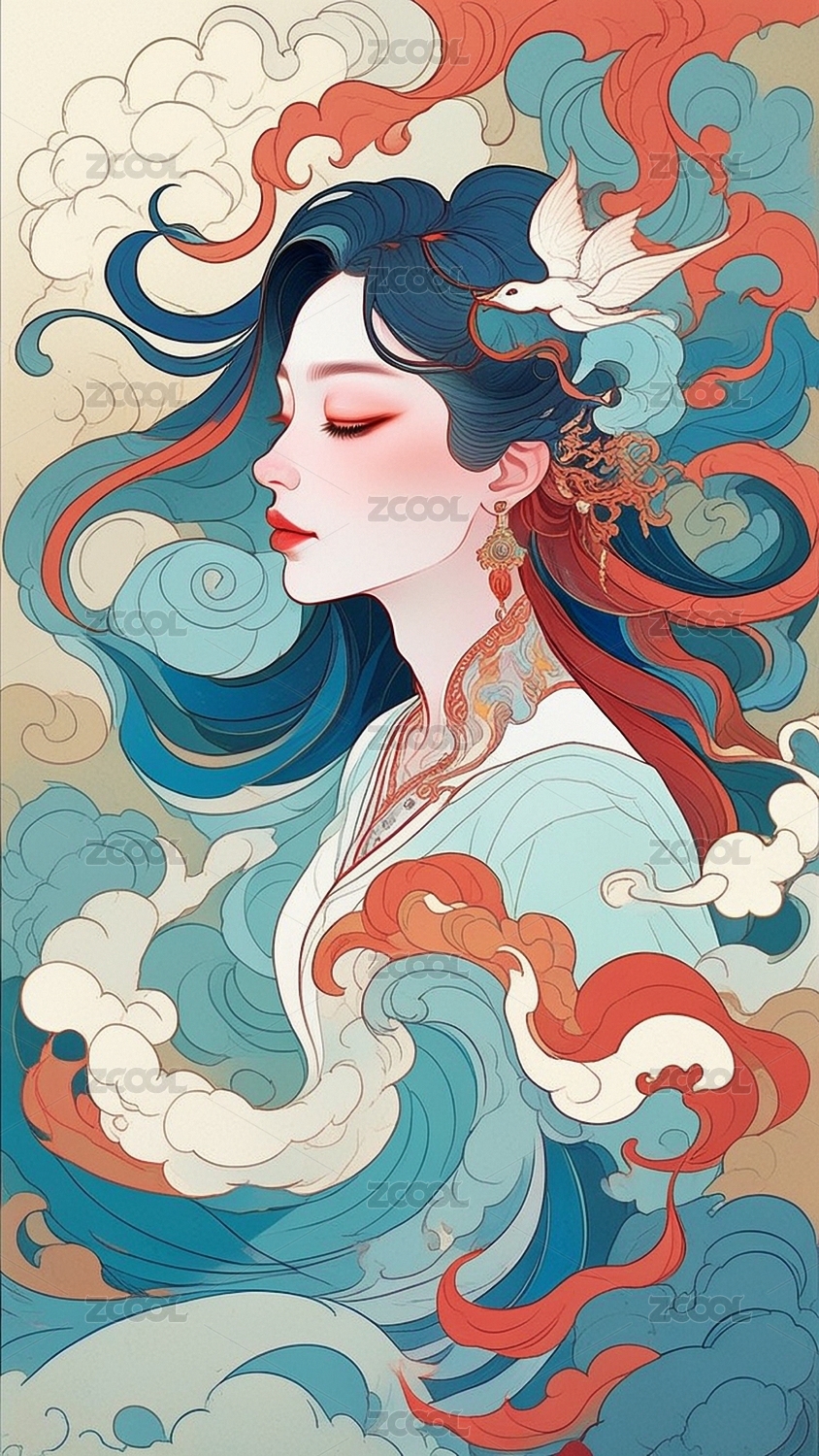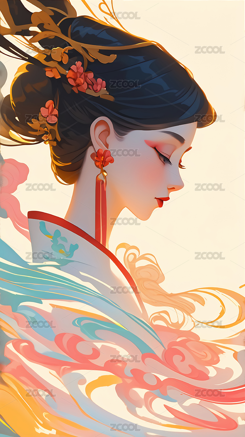 国潮,中国风,女孩,人物,插画,写意,创意,艺术,AIGCFG,古典