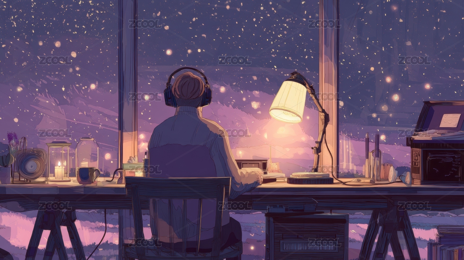夜晚窗边工作的人