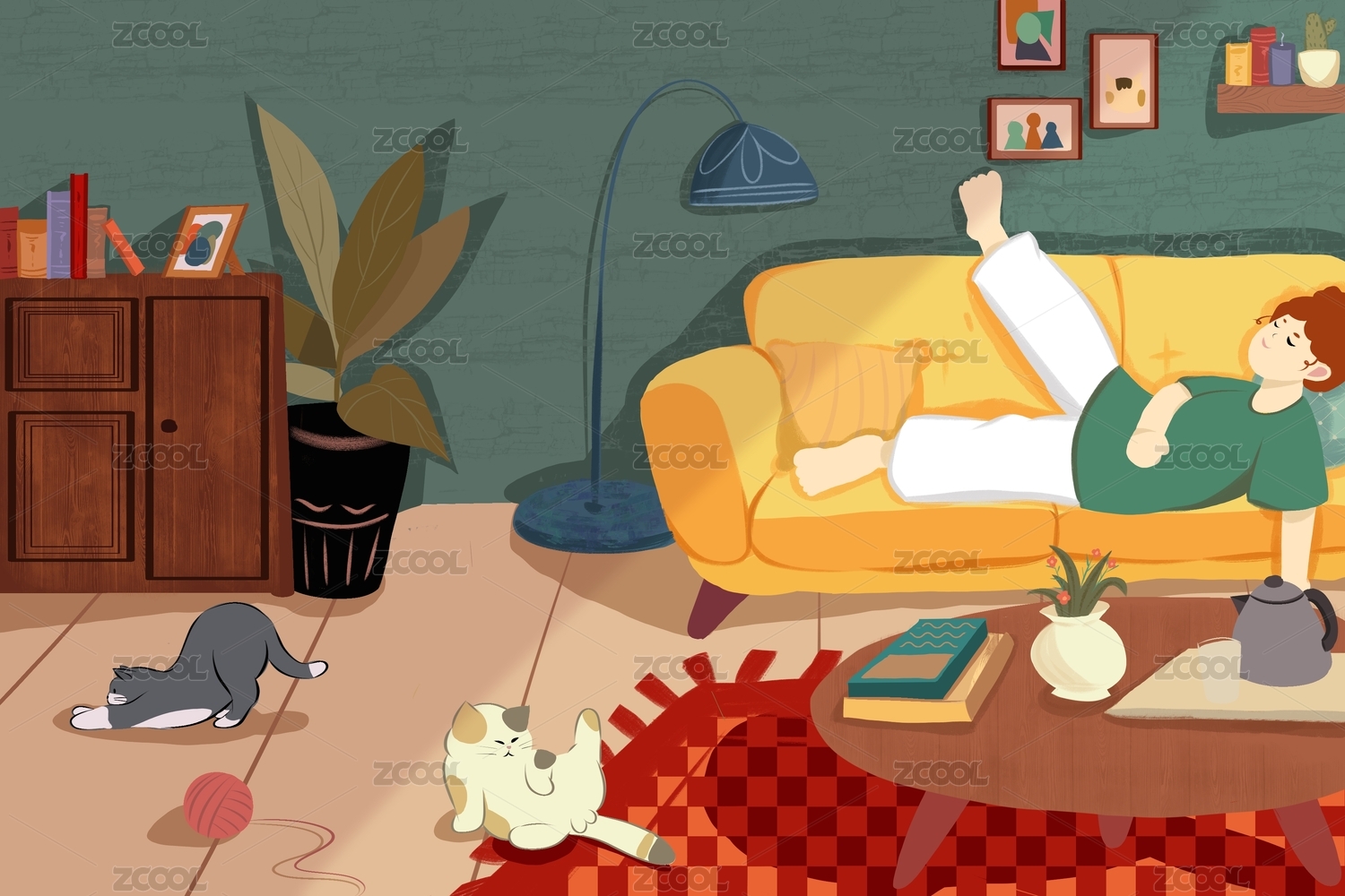 午后休闲-女孩沙发周末扁平插画
