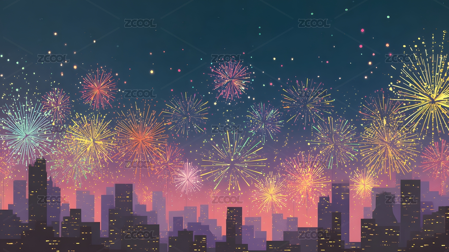 烟花城市建筑矢量插画
