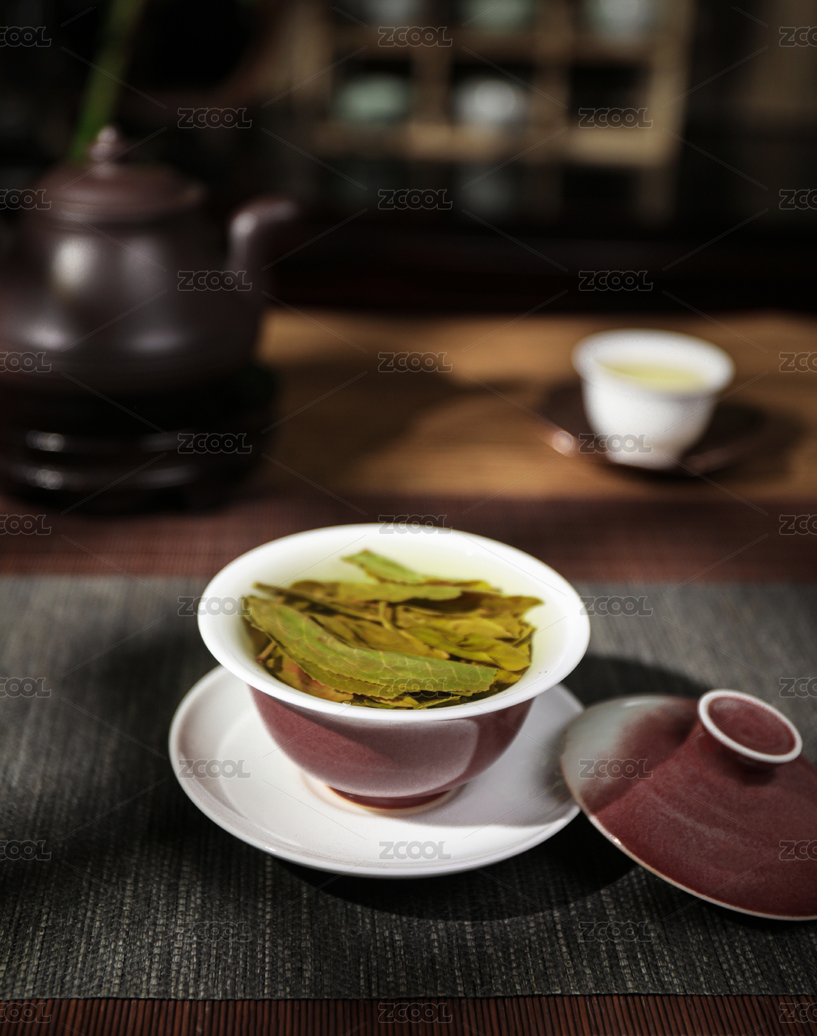 木托盘与茶杯中的茶叶