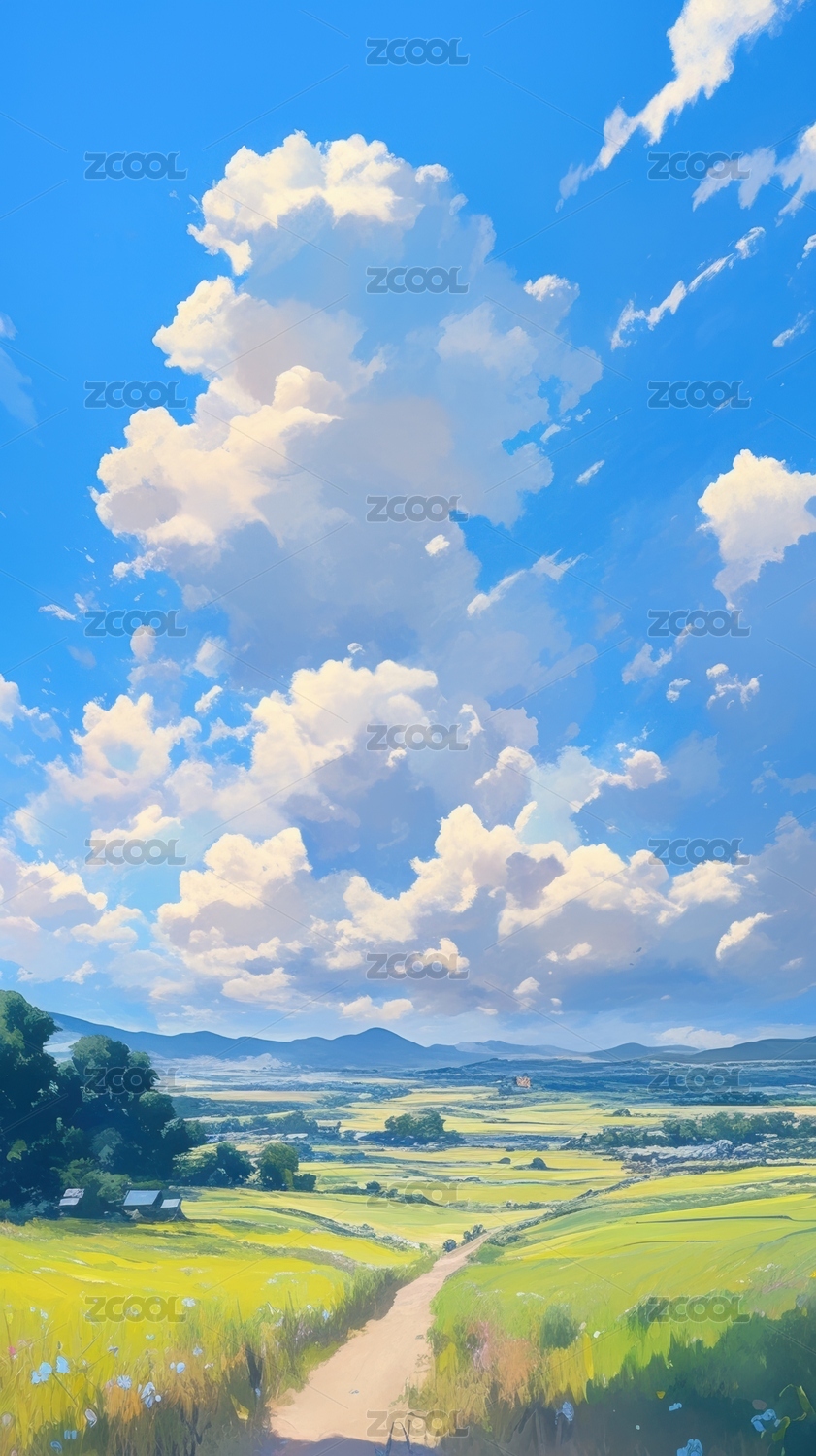 蓝天,白云,大树,春天,田野,植物,山,动漫,插画,清新