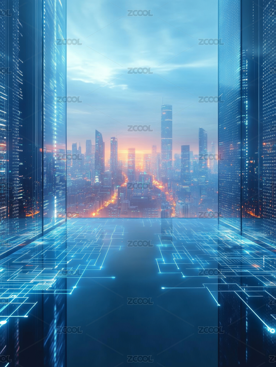 未来城市天际线与网格反射