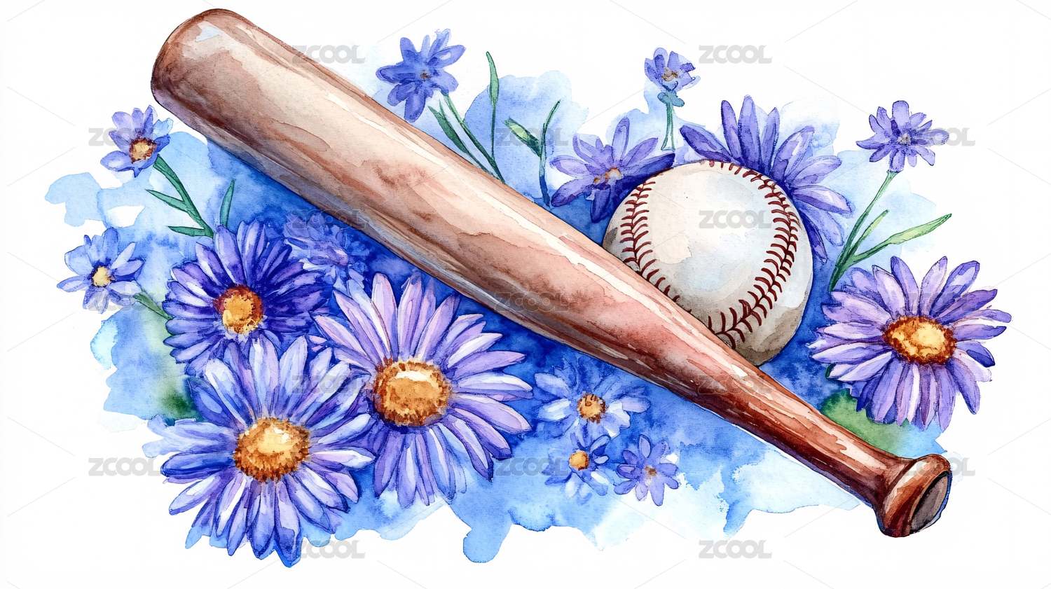 水彩棒球与紫花