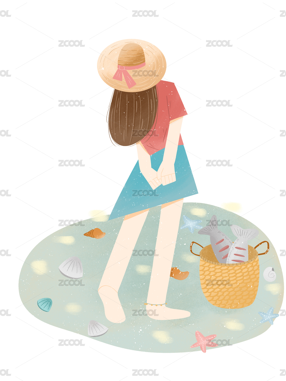 坐在草地上和猫咪一起野餐的少女手绘插画
