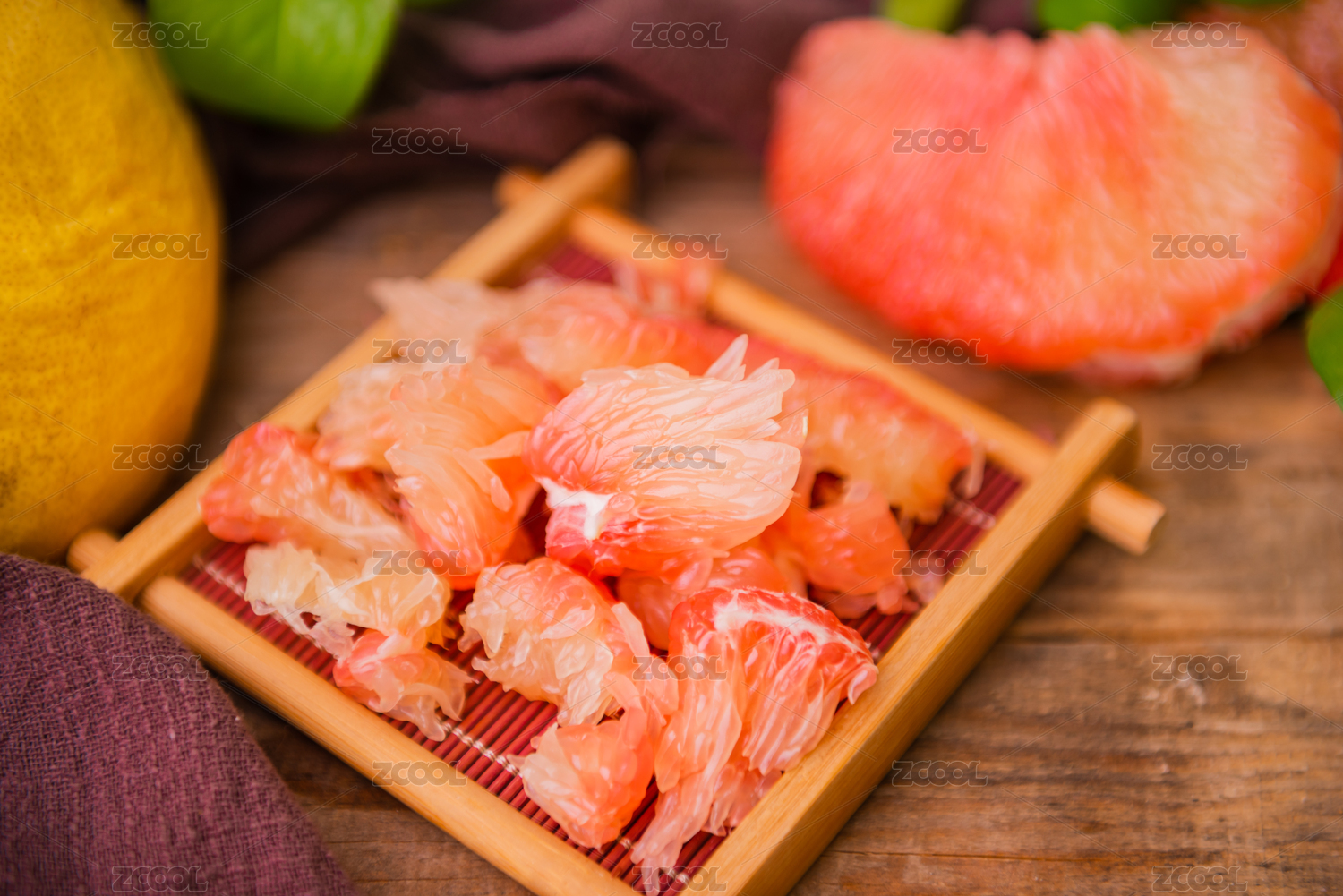 木垫子上放着一盘剥开的三红蜜柚果肉