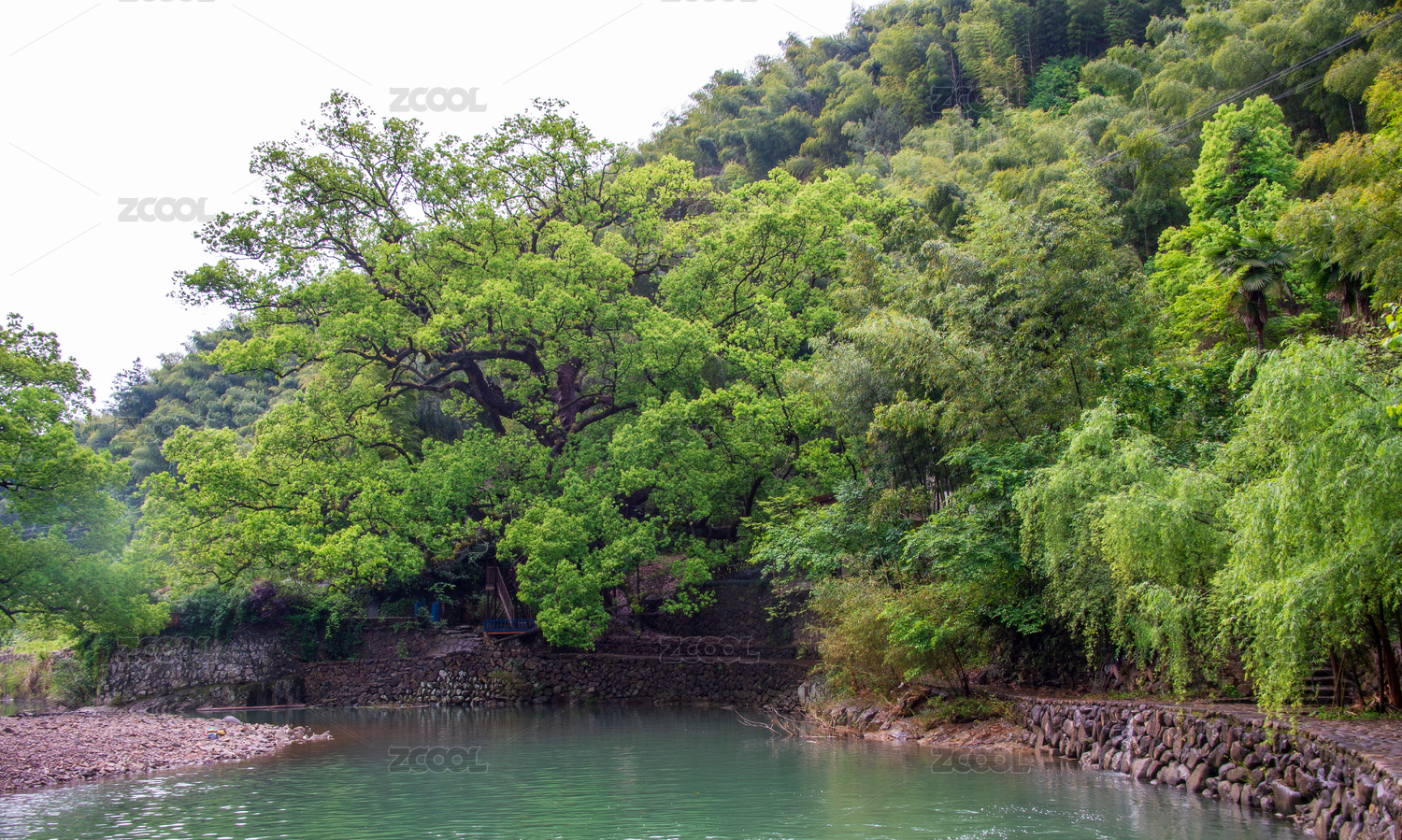 中国浙江省杭州富春江镇风光及千年古樟树风