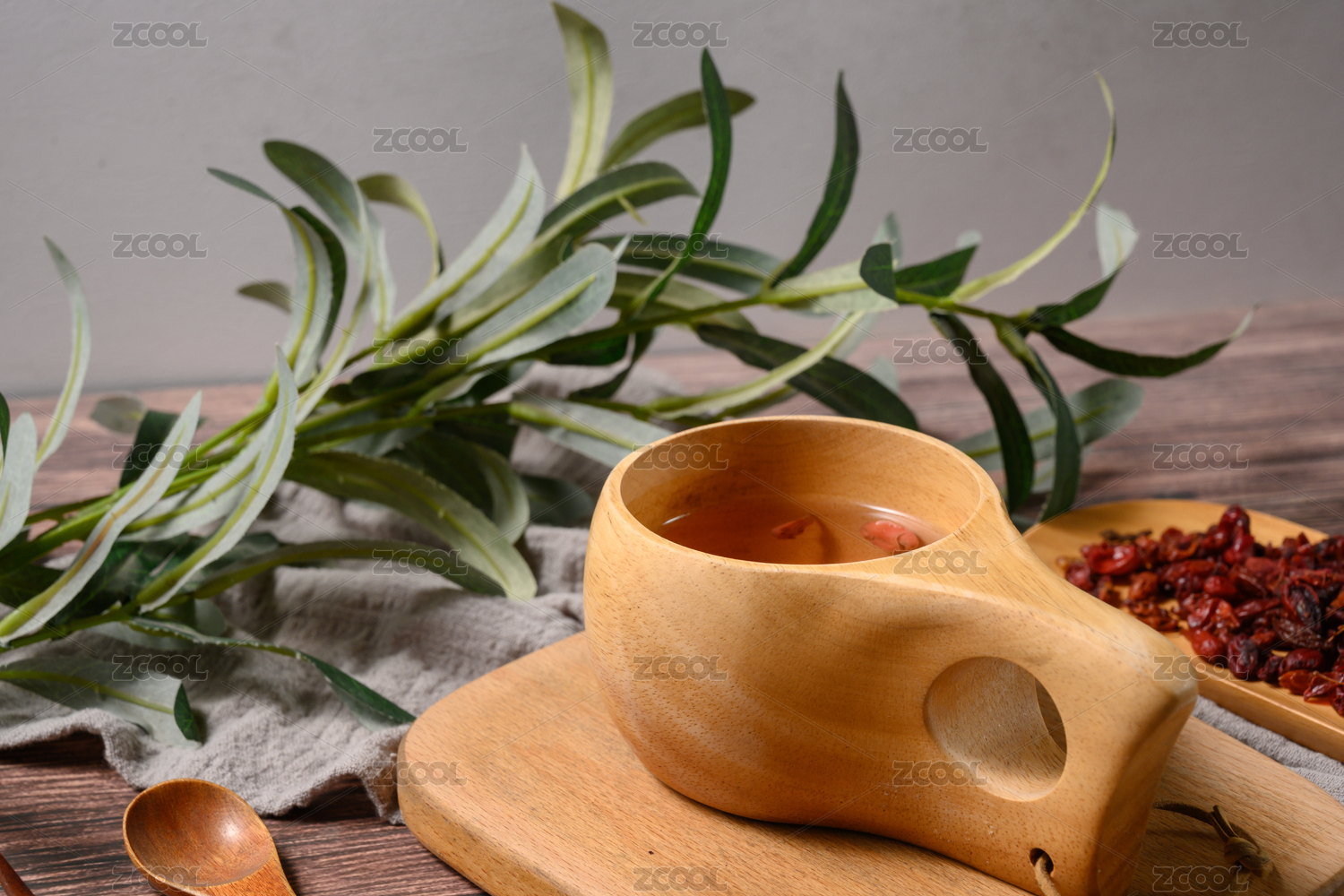 桌面上的杯子里的甘甜可口的山茱萸茶
