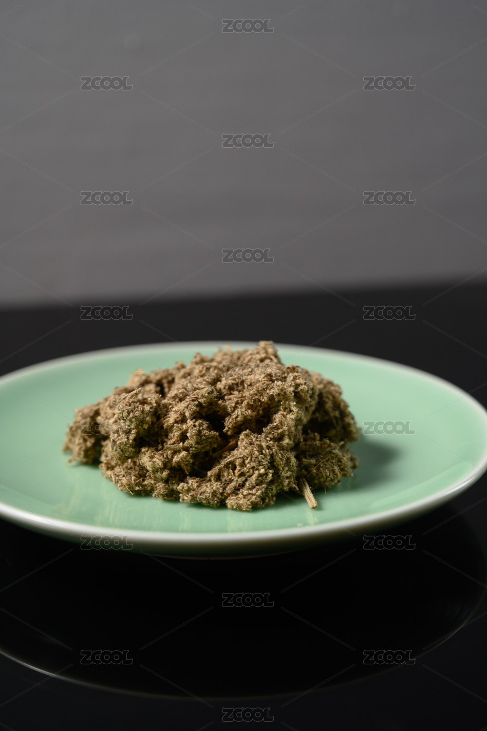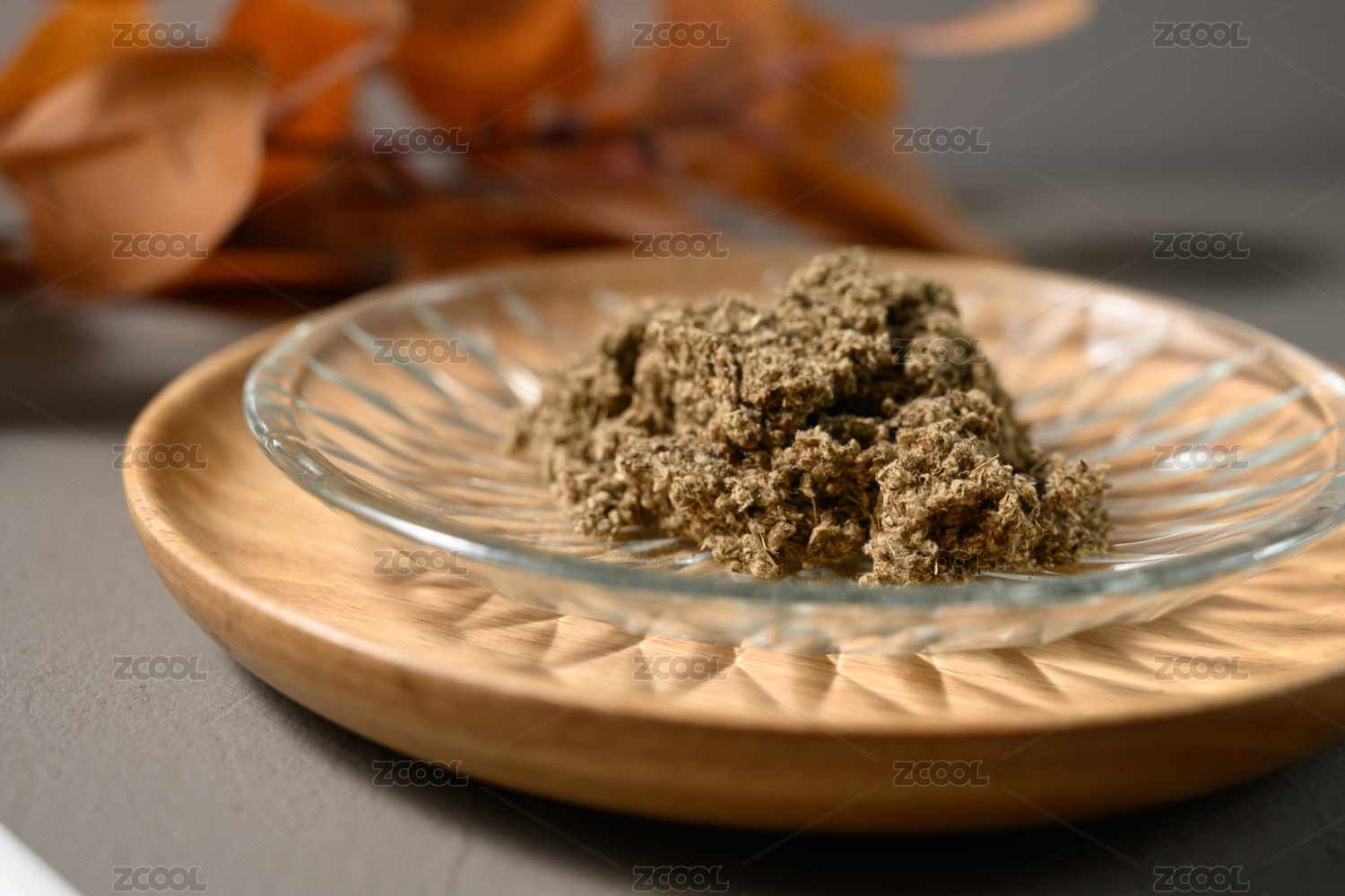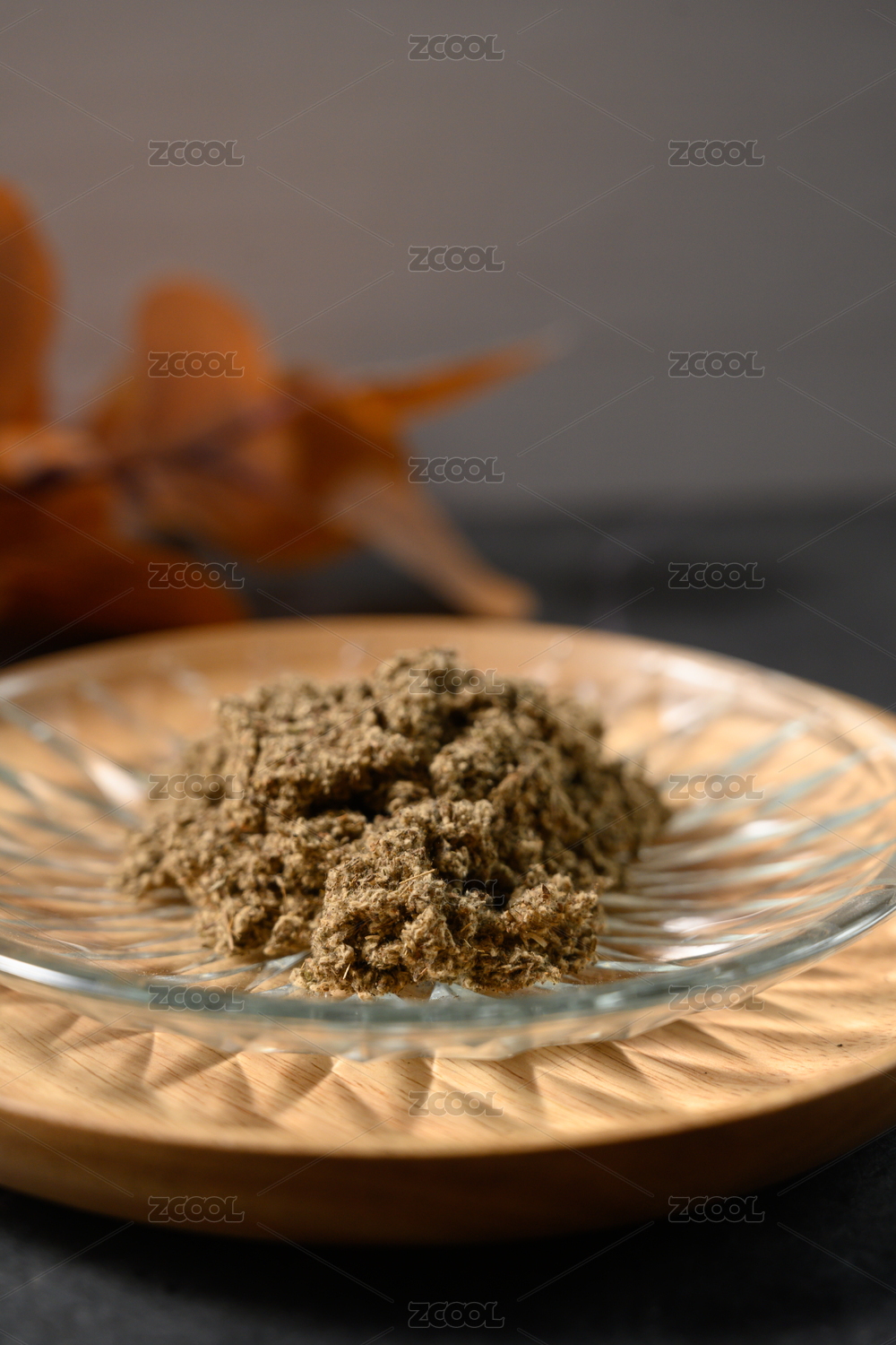 桌面上的盘子里的香气四溢的艾草绒