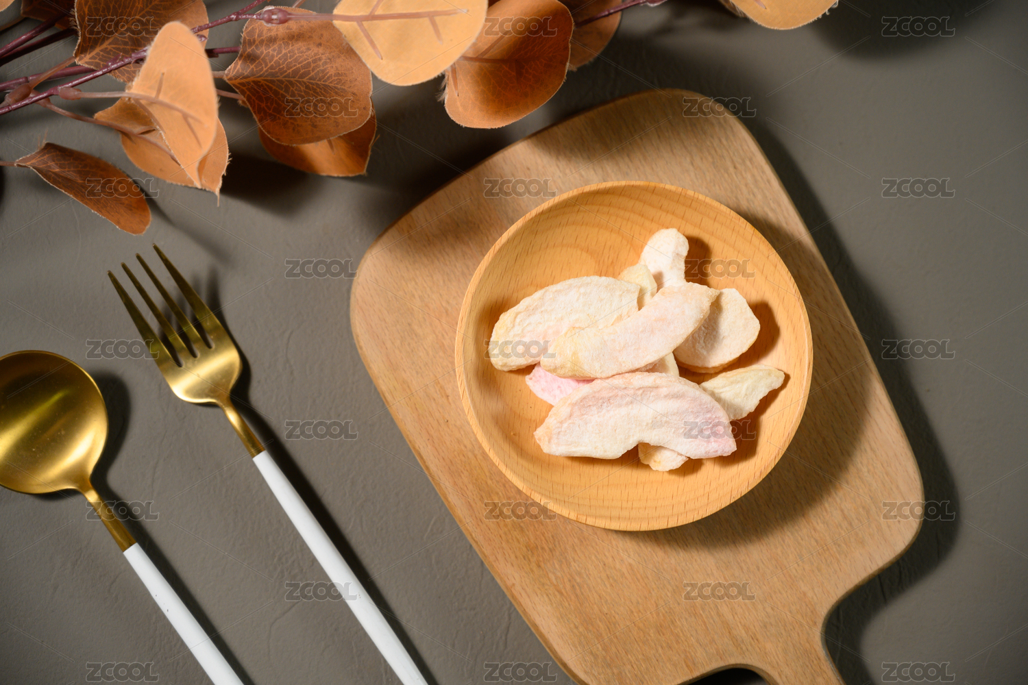 桌面上的盘子里的美味课口的冻干水蜜桃干