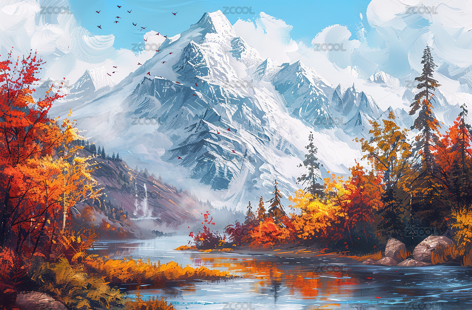 唯美自然山水风景水墨插画