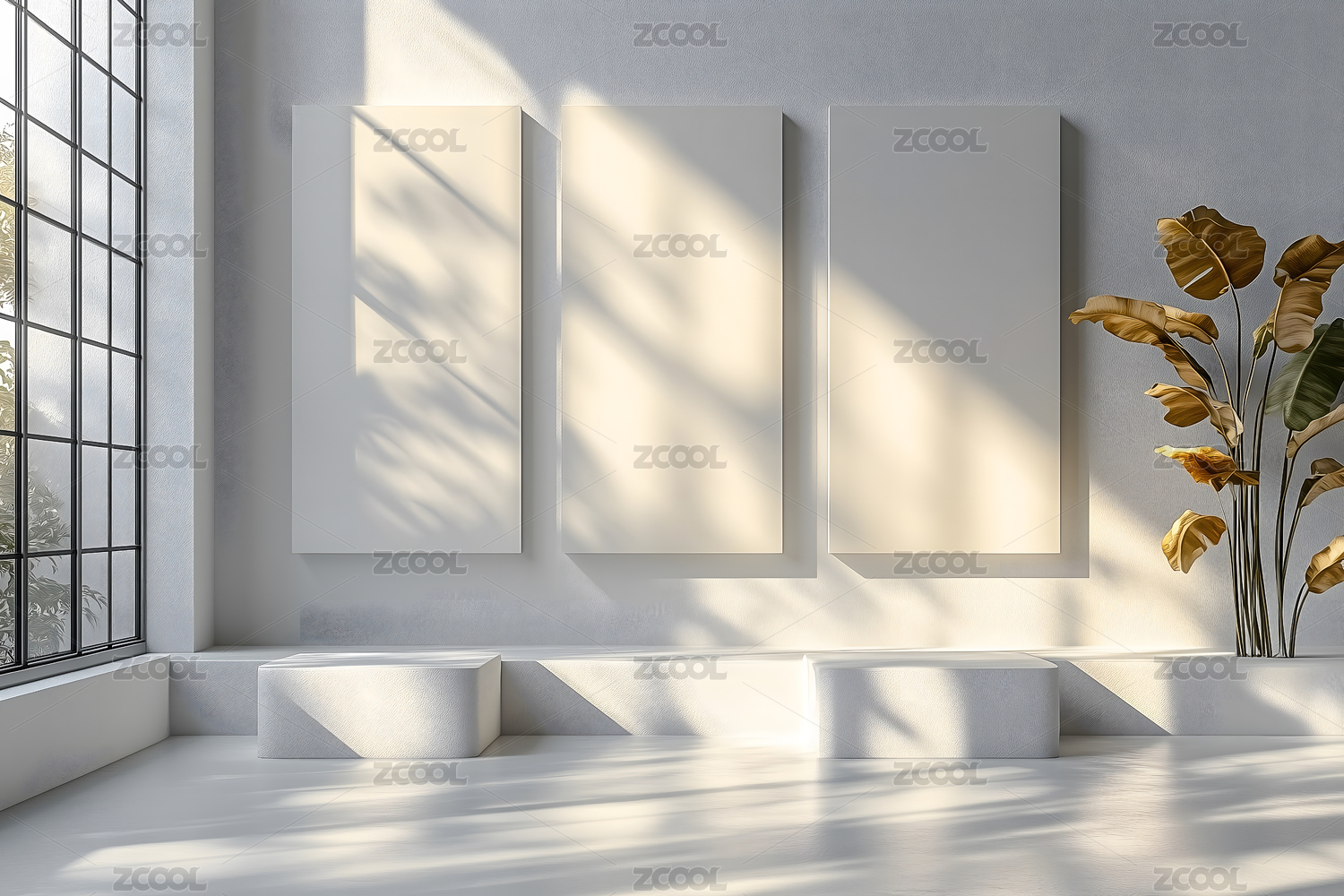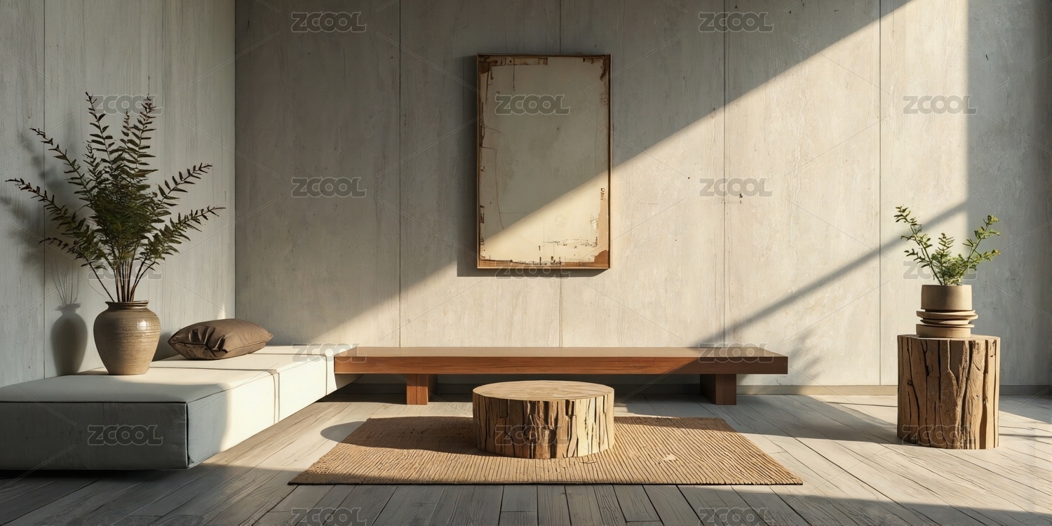 极简装饰的室内带花瓶和木质雕塑电商展台