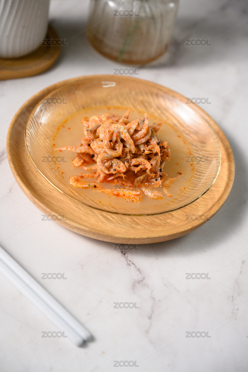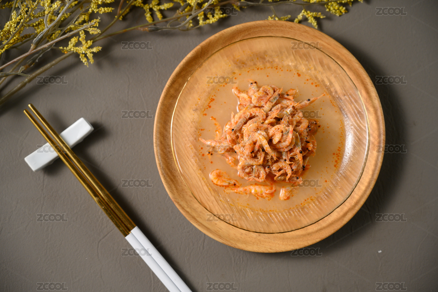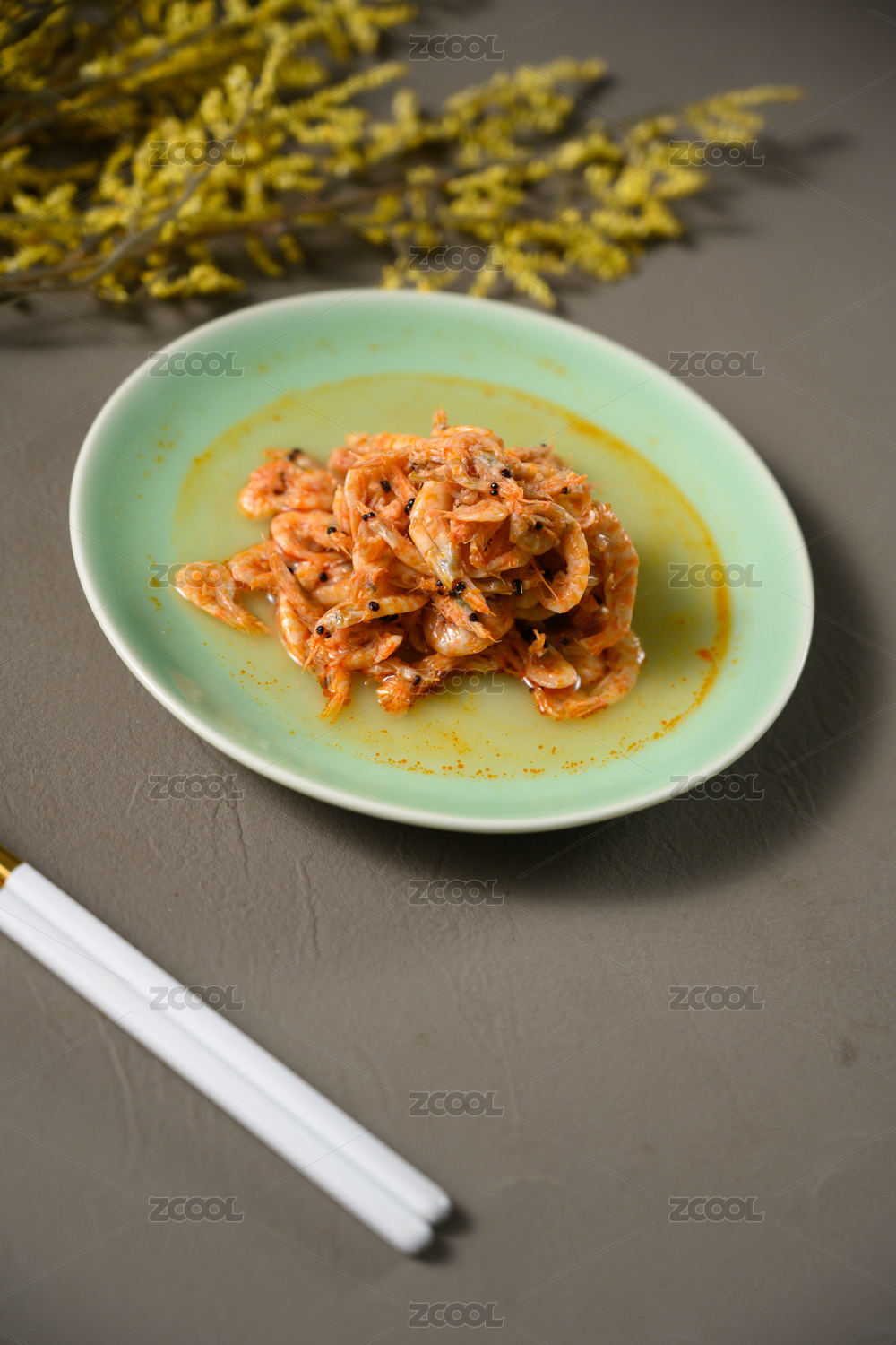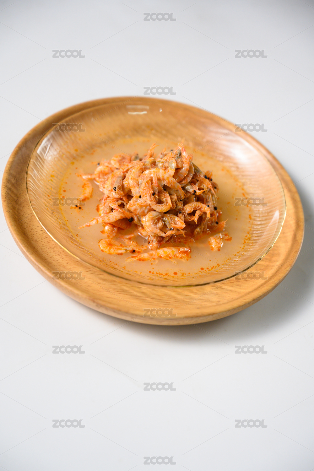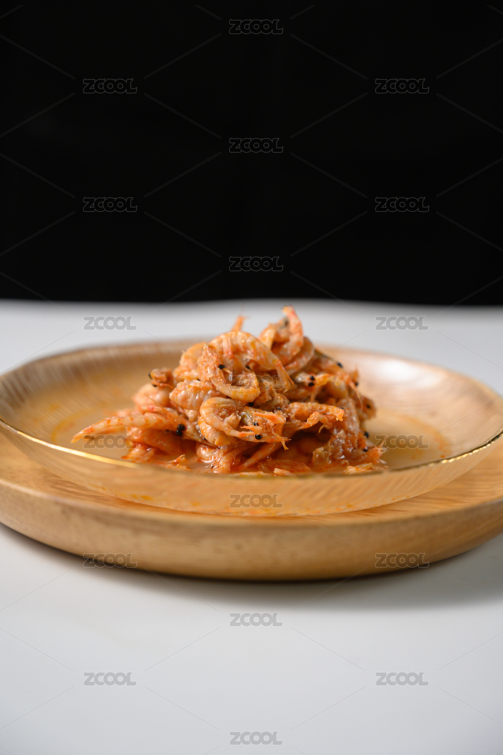 桌面上的盘子里的美味可口的磷虾干