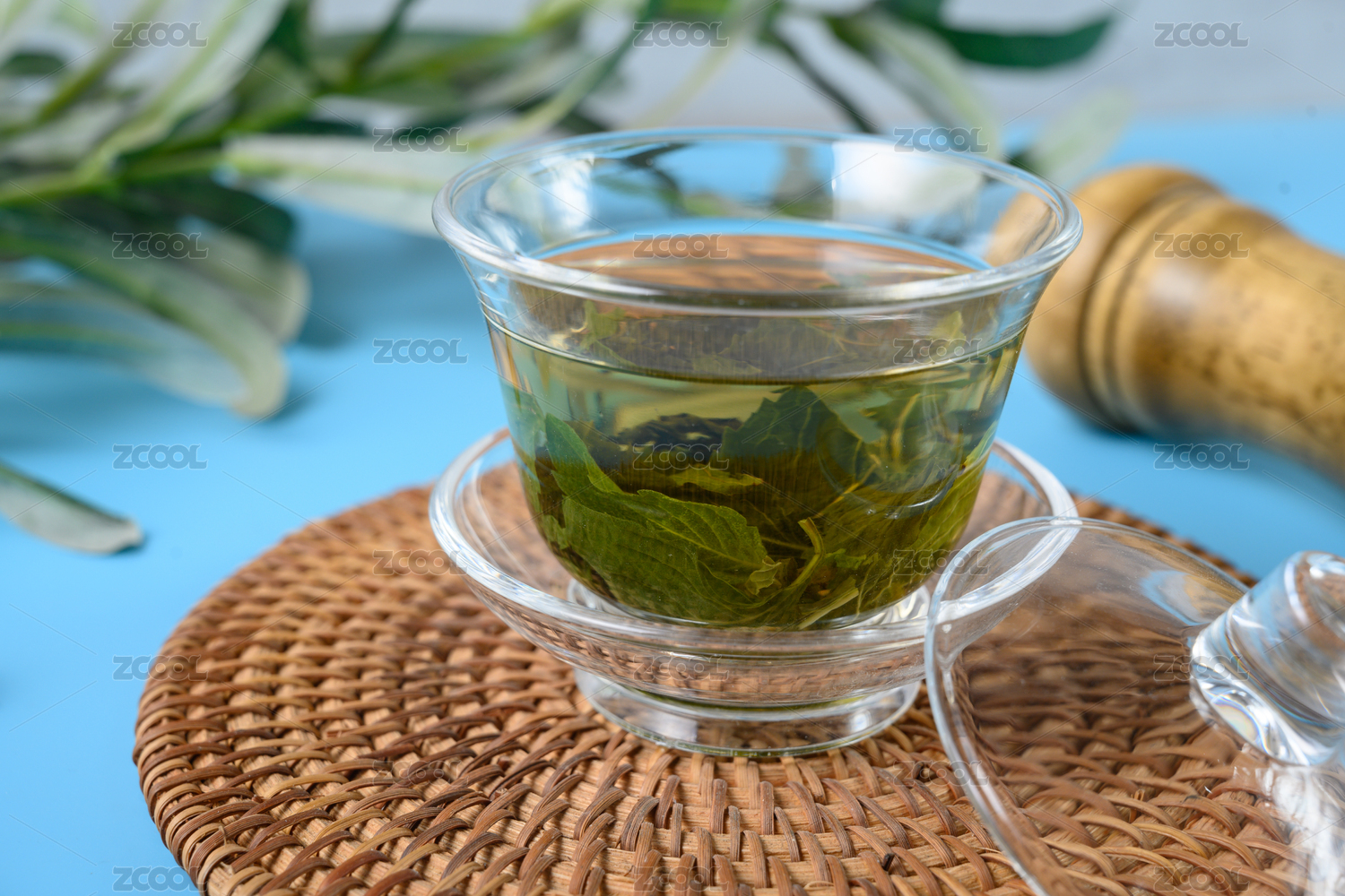 桌面上的杯子里的甘甜可口的马鞭草茶