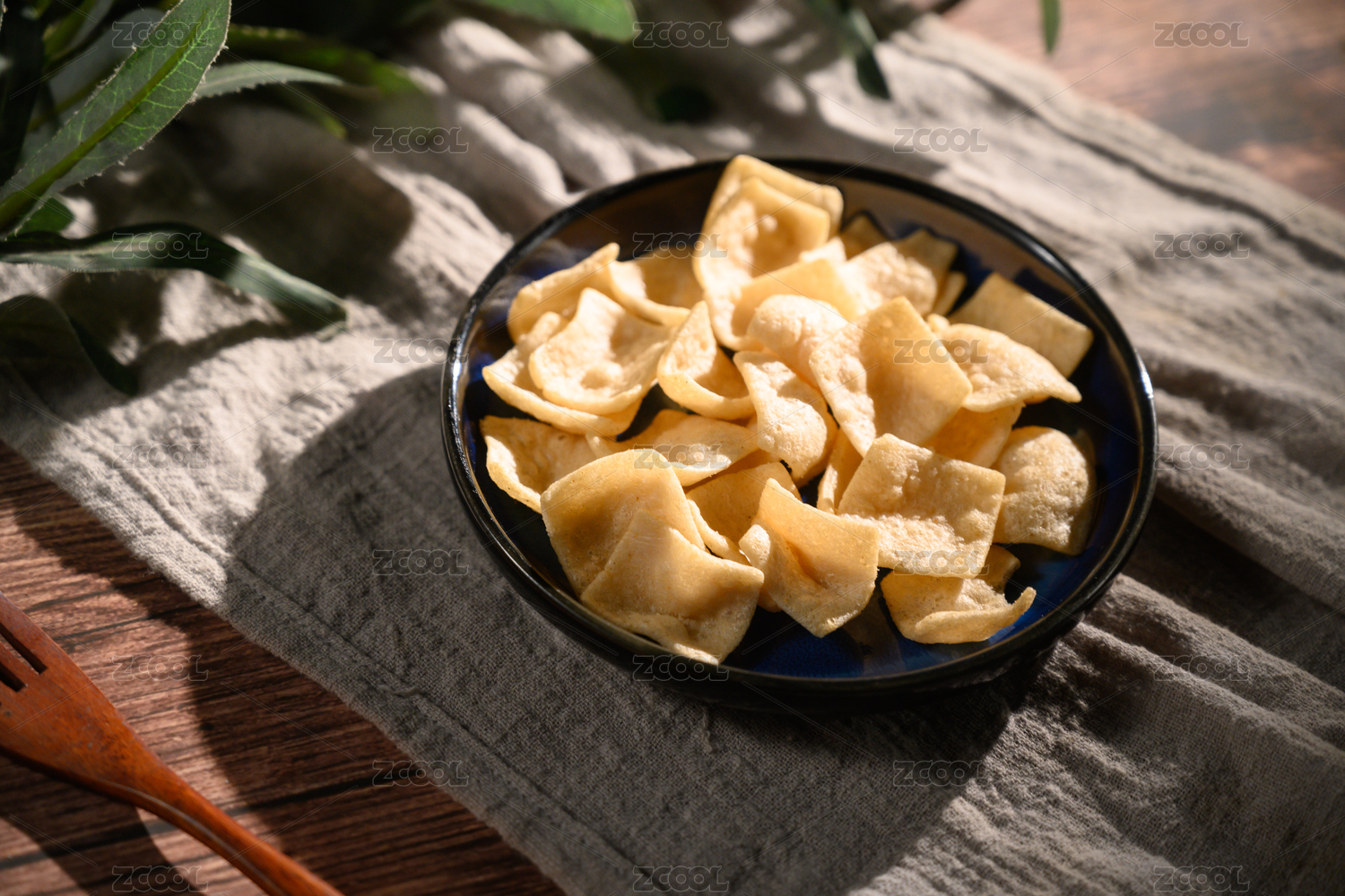 桌面上的盘子里的美味可口的虾片