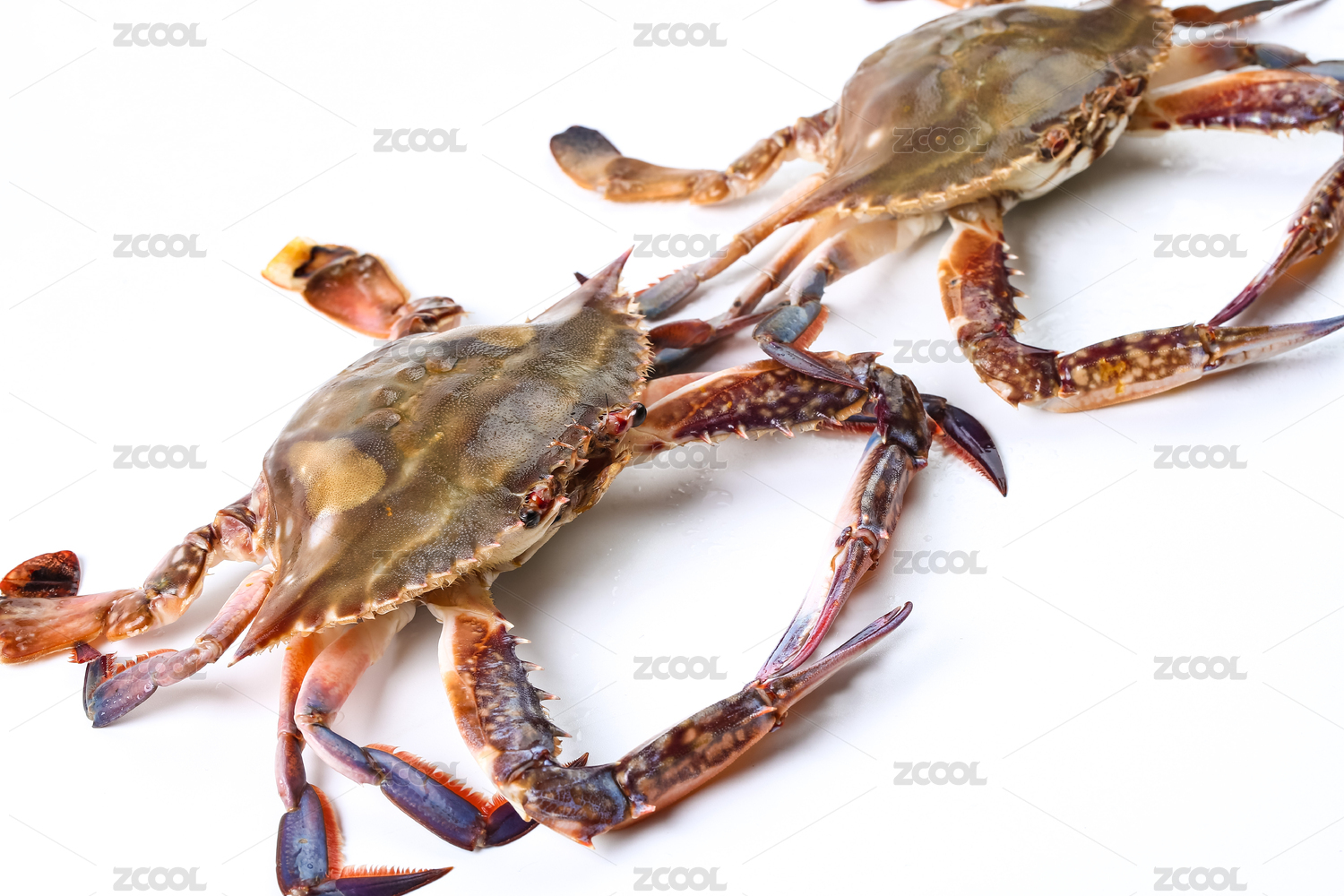 白底上的两只生鲜梭子蟹
