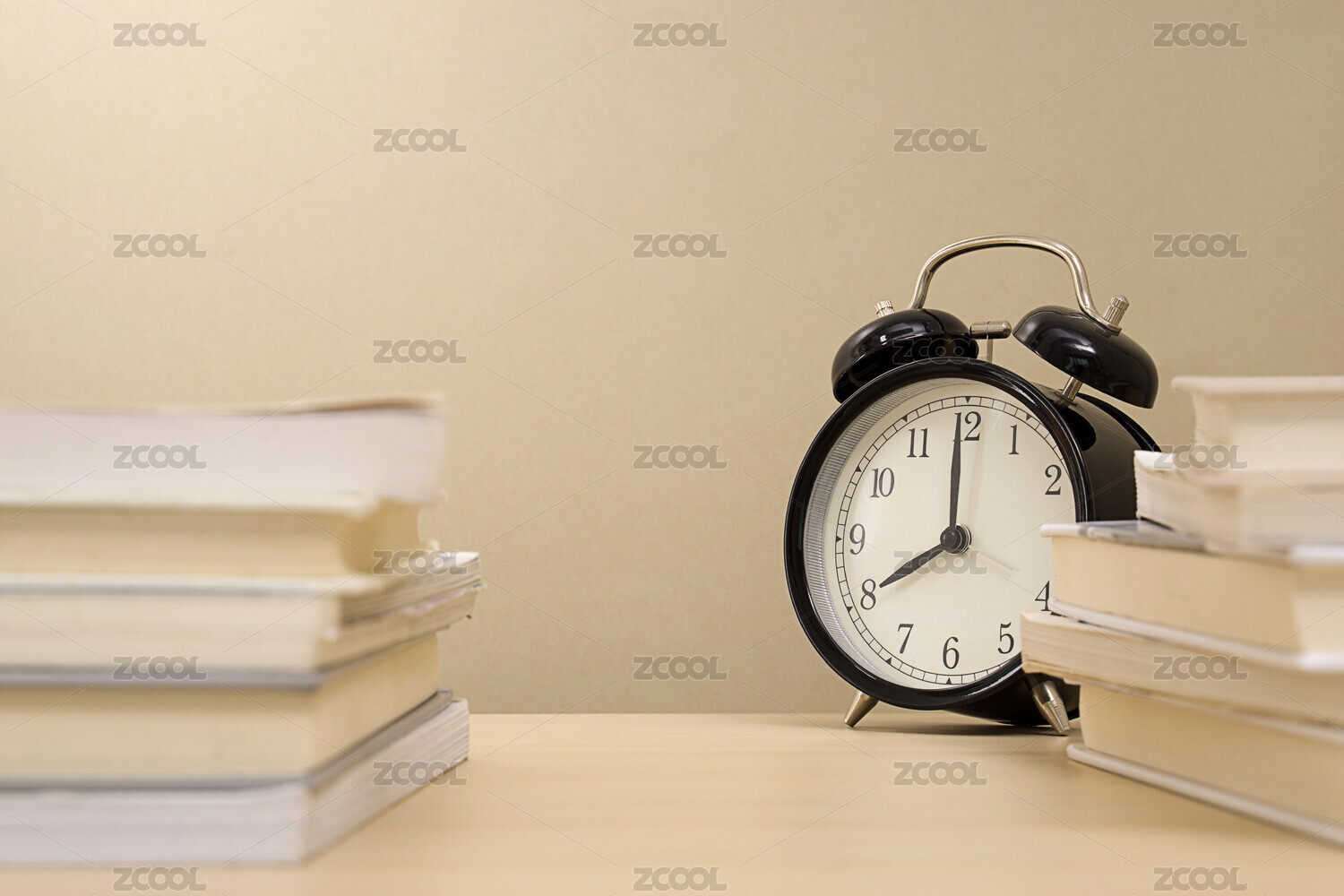 摆放在书桌上面的书籍与黑色闹钟