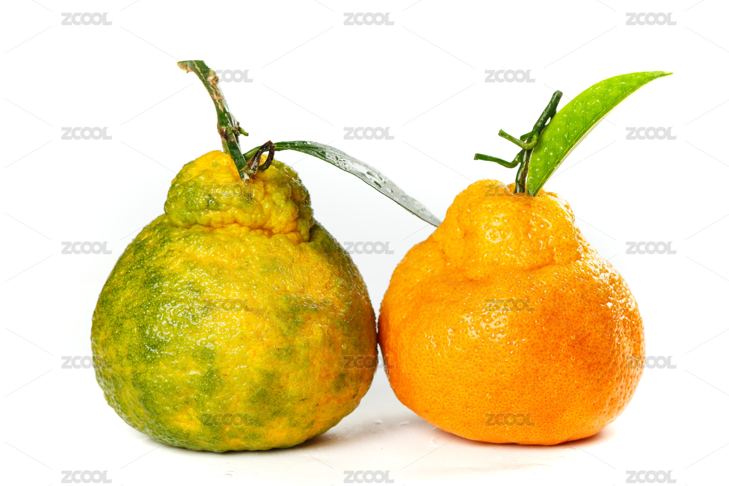白底上放着一个青皮丑橘和一个黄皮丑橘对比