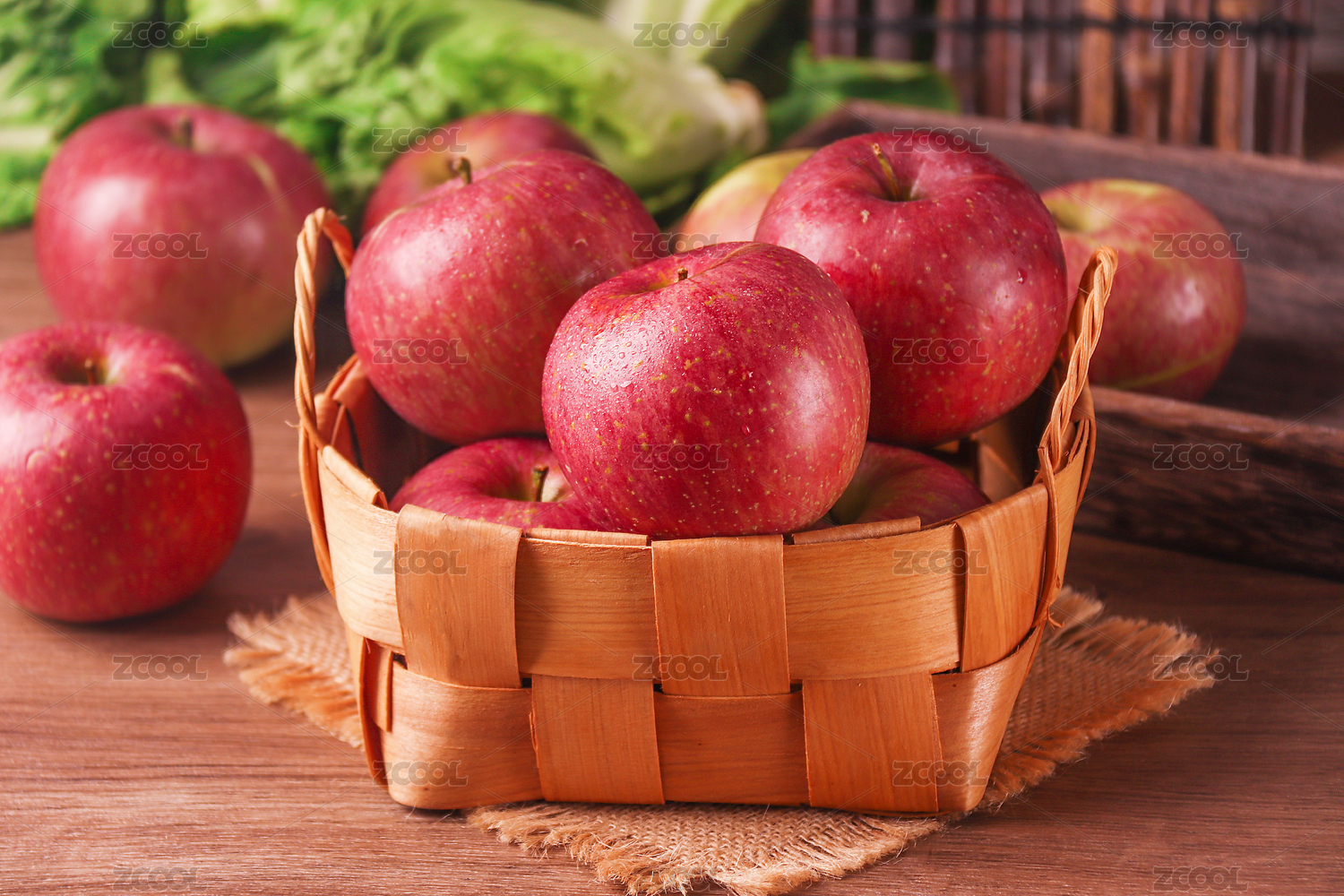 木底上放着一篮红苹果