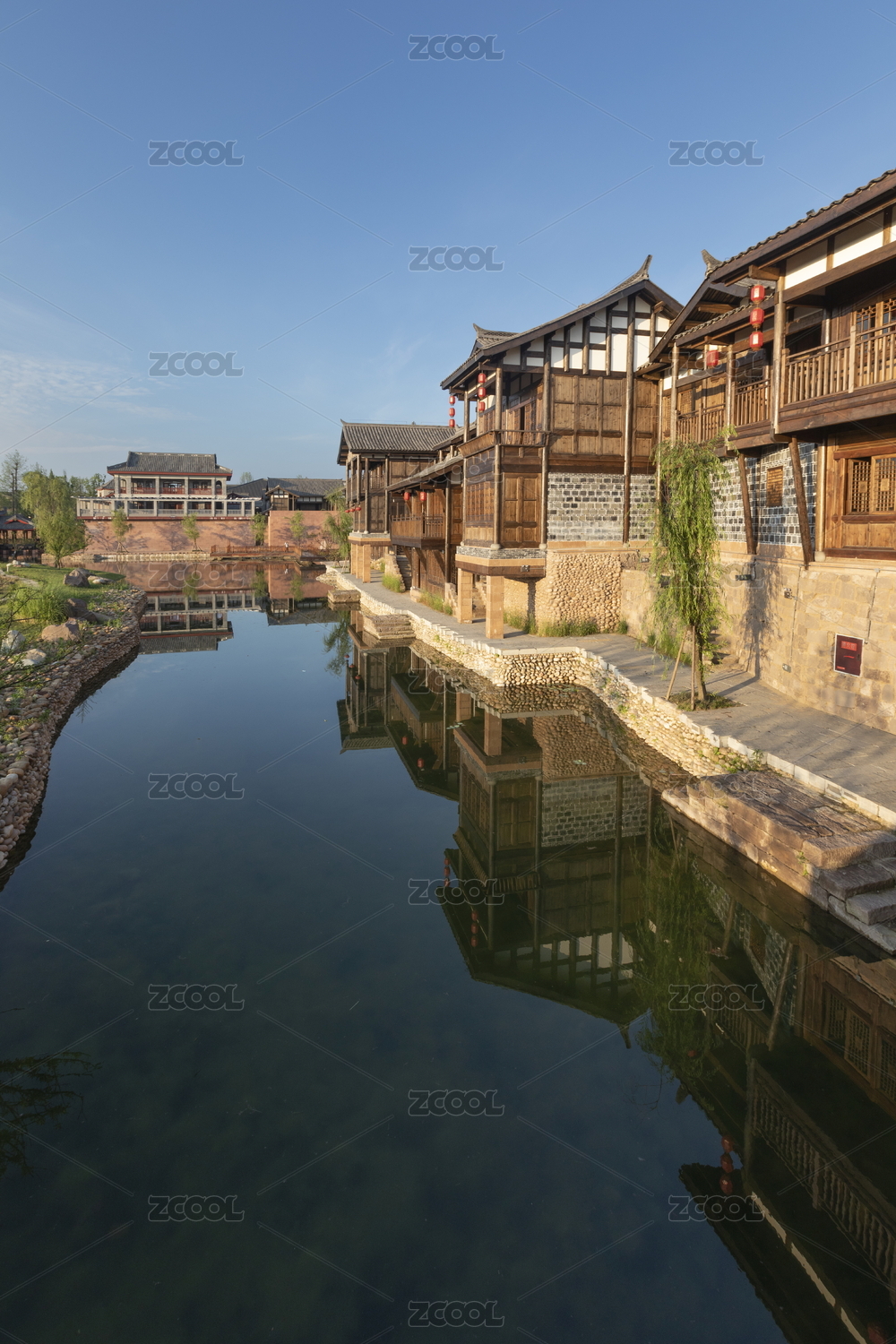 四川宜宾李庄古镇木结构青瓦房水面光影
