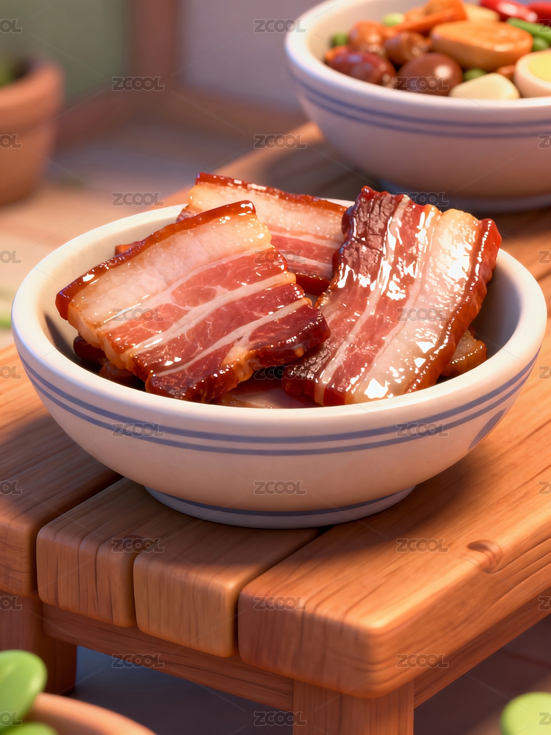 陶碗里面放着一块猪五花腊肉和几片切好的猪五花腊肉,四周还放着一些香叶、桂皮、辣椒干等香料,木纹背景.