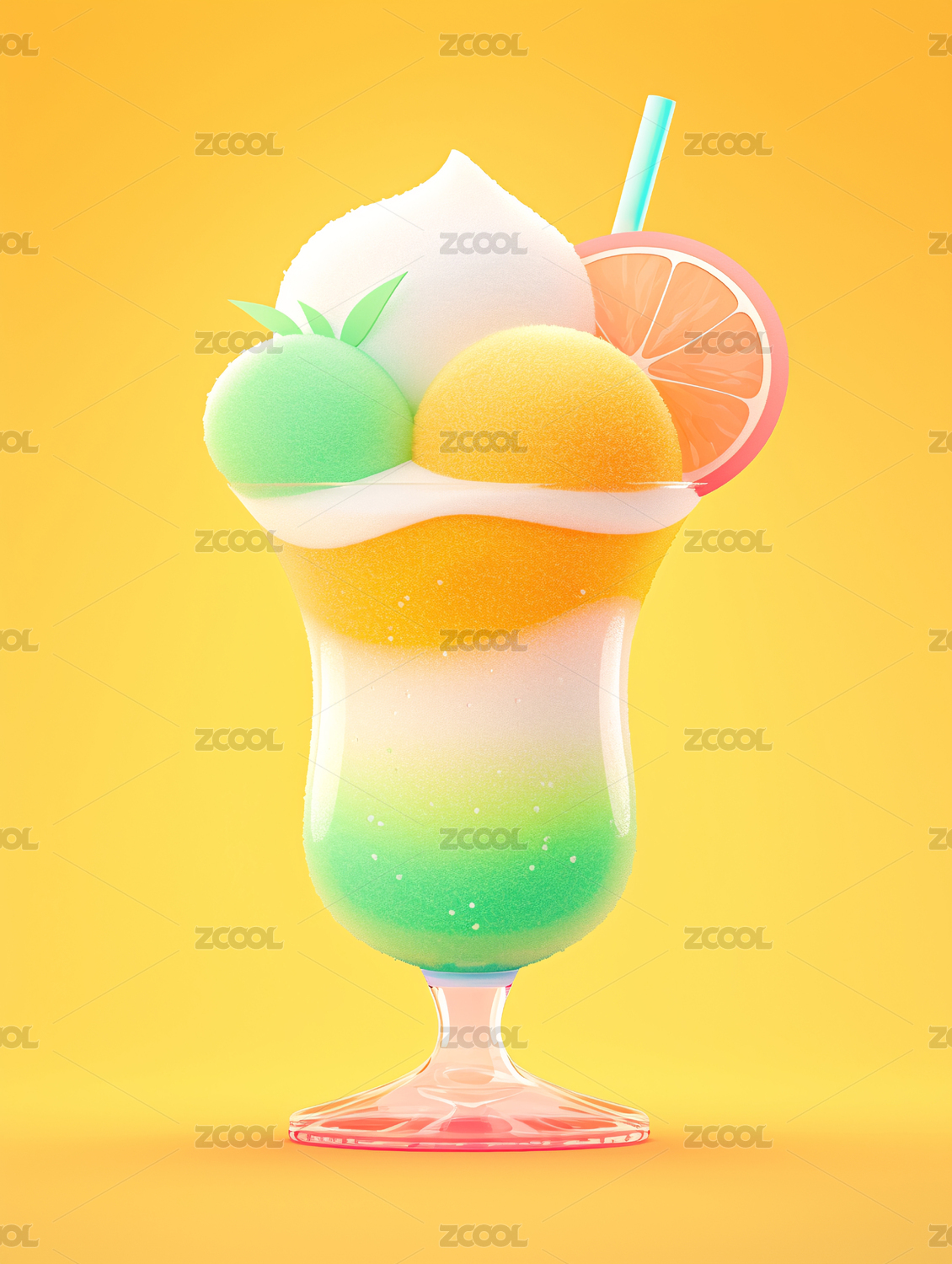 黑底鲜艳的果汁飞溅的水果冰淇凌3D插画